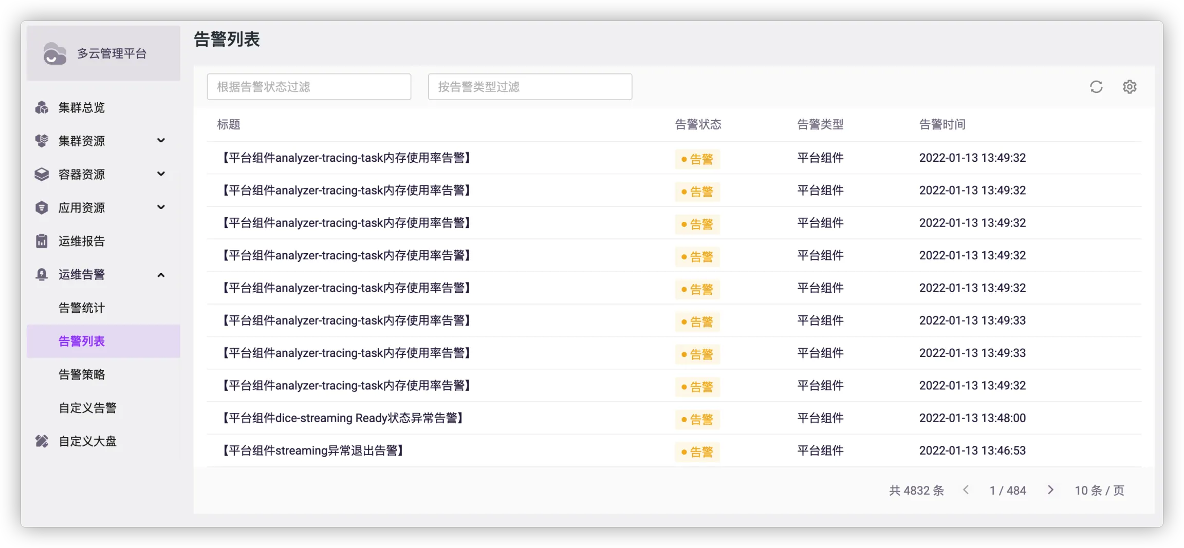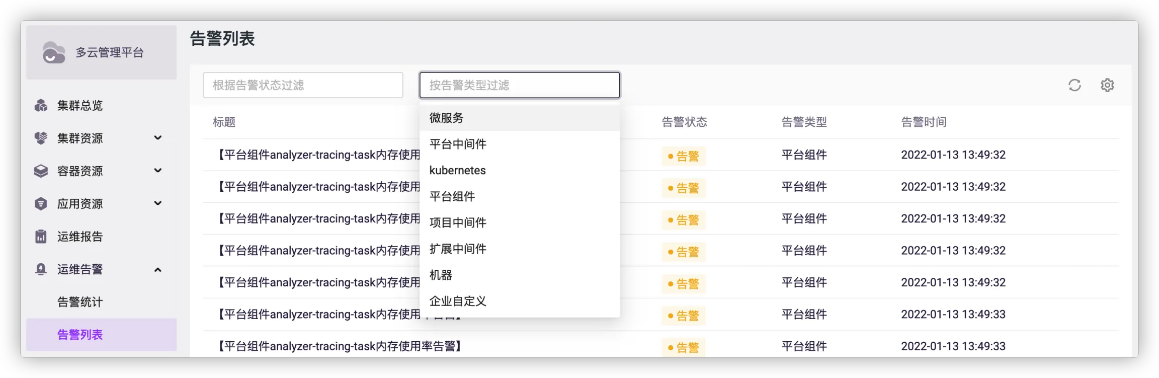 进入 多云管理平台 > 运维告警 > 告警列表,您可以查看平台下所有的告警记录。