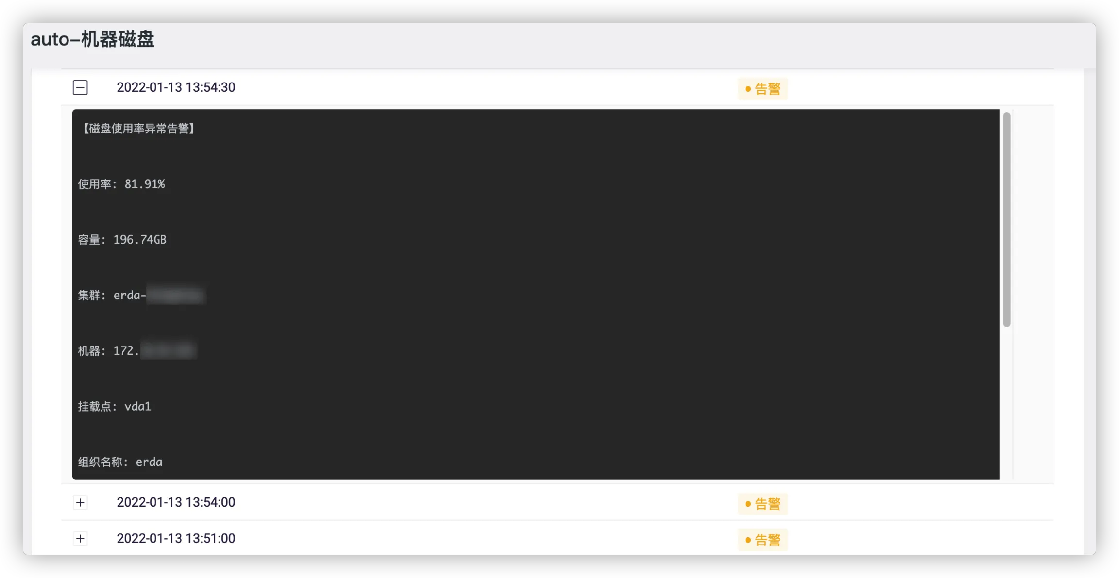 告警列表中仅显示最近一次的告警记录,点击对应告警记录可查看其历史告警信息。