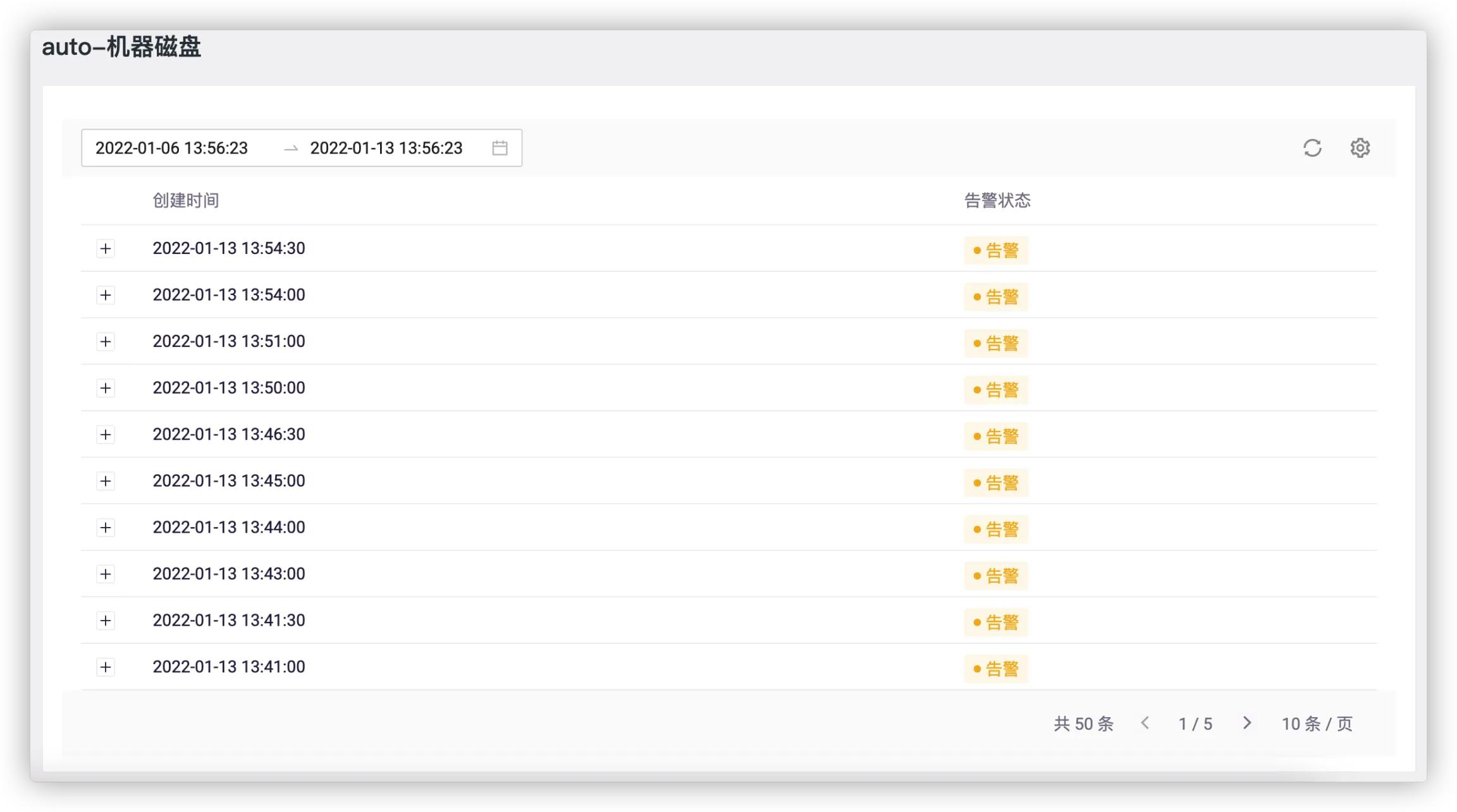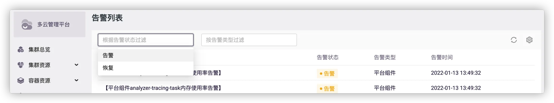 告警列表按照更新时间倒序显示所有告警记录,同时支持通过告警状态及告警类型筛选。