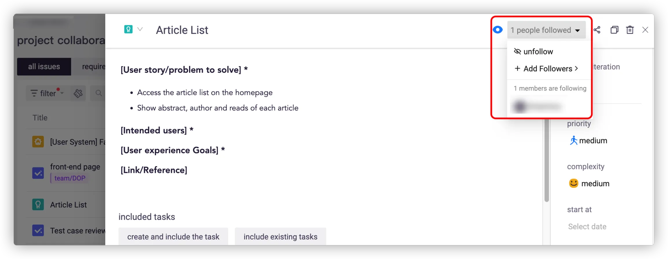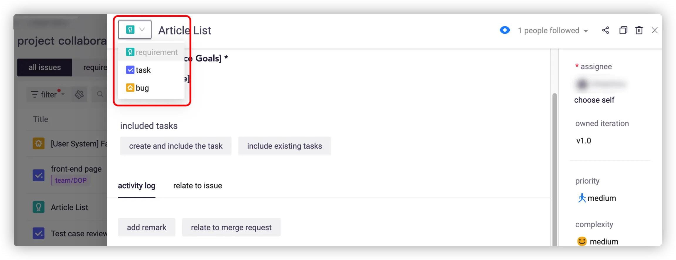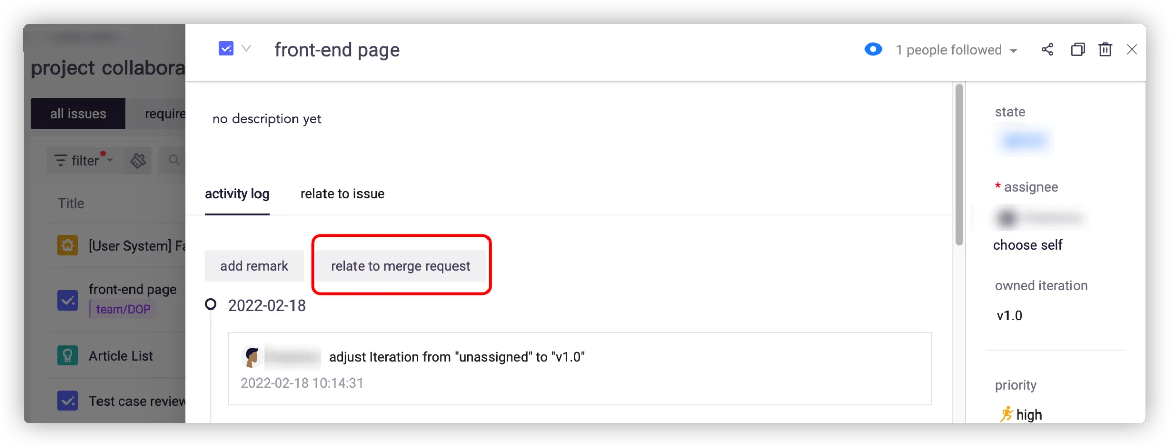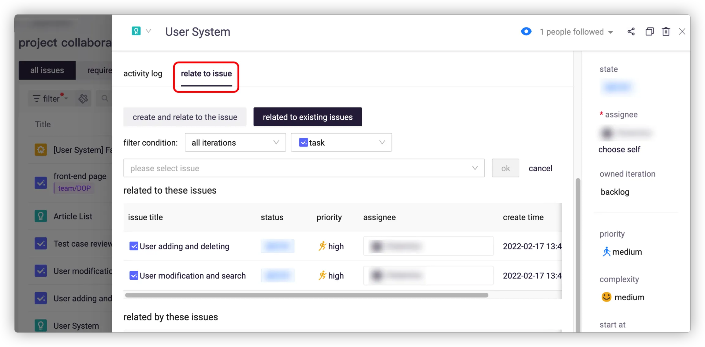You can relate the issue to others for better collaboration. The progress of requirement will be automatically updated according to the status of related issues.