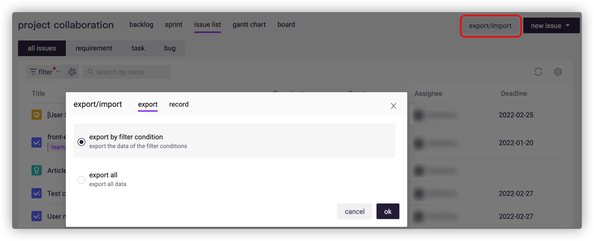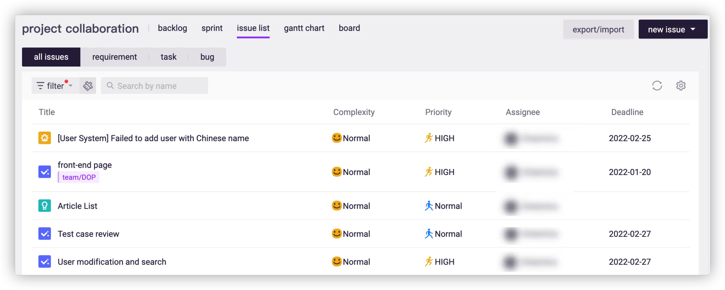The platform supports importing and exporting issues in batches in XLSX files as needed.