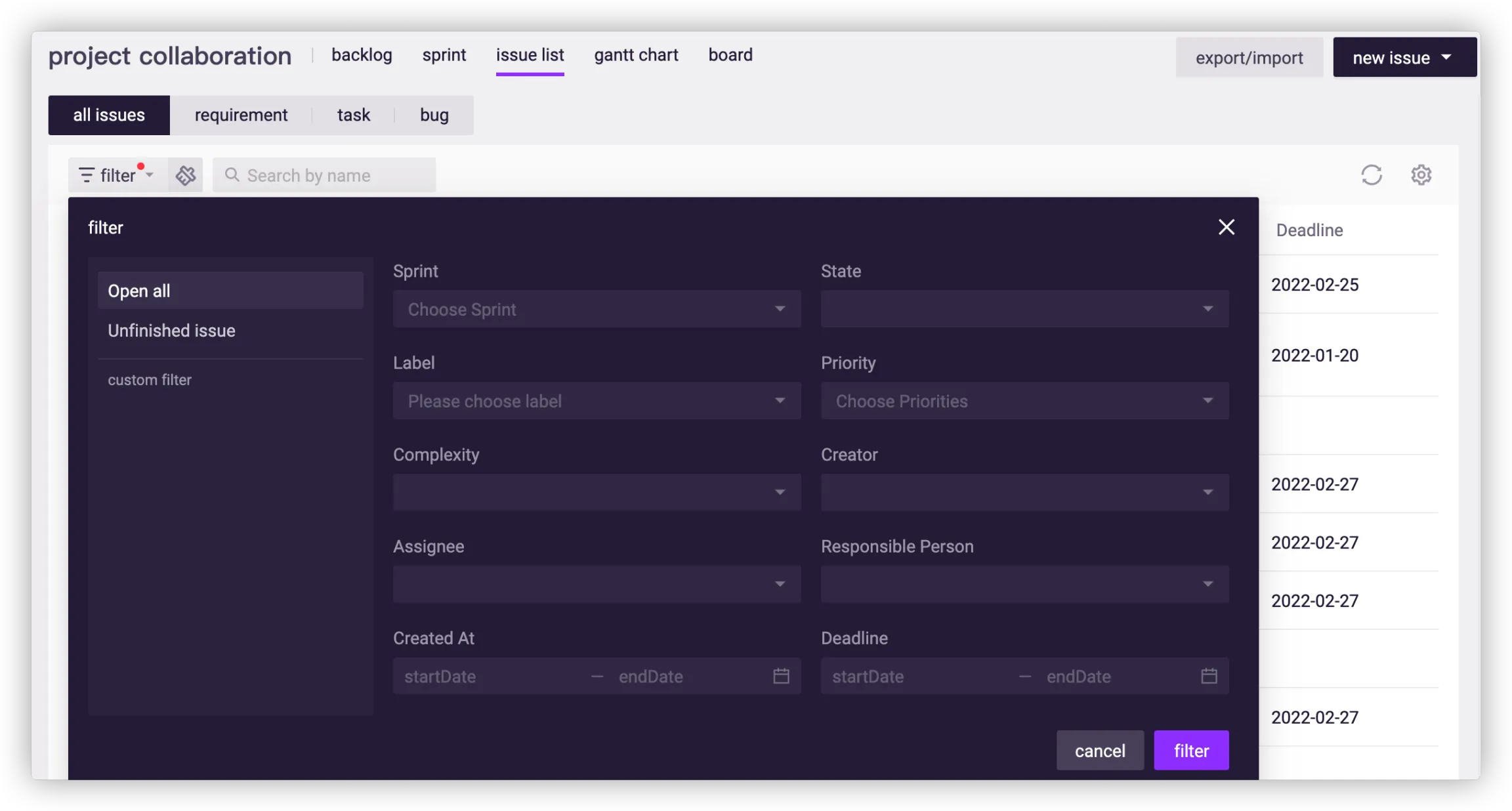 The platform supports issue filtering. You can customize the filtering conditions and the corresponding issues will be displayed as a result.
