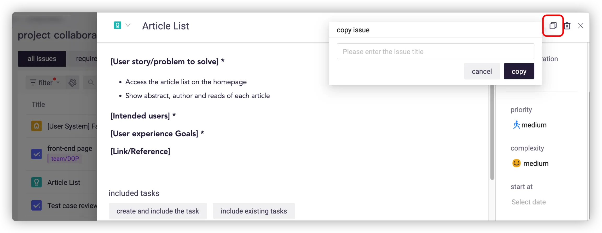The platform supports issue copying, which can be achieved by entering a new title, but the activity log will not be copied.