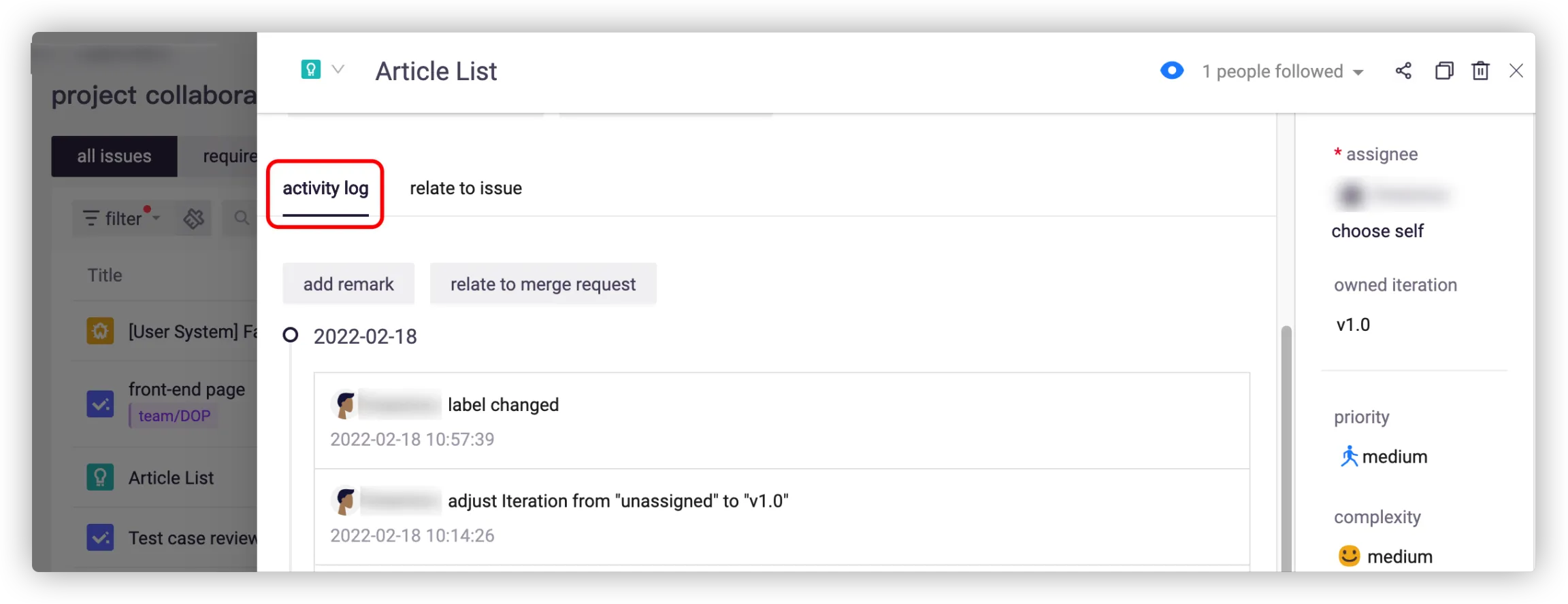 The platform supports activity log recording for issues. Any modification of issues will be recorded and cannot be deleted.