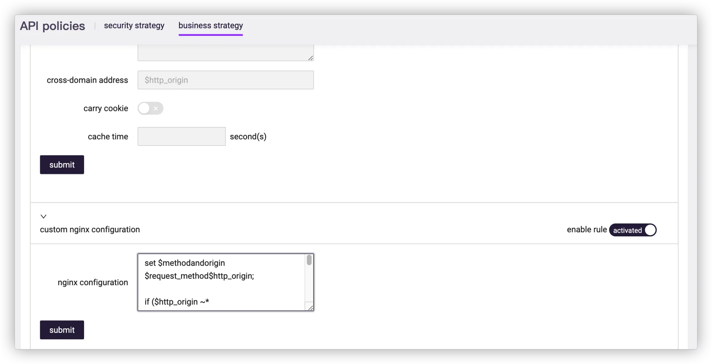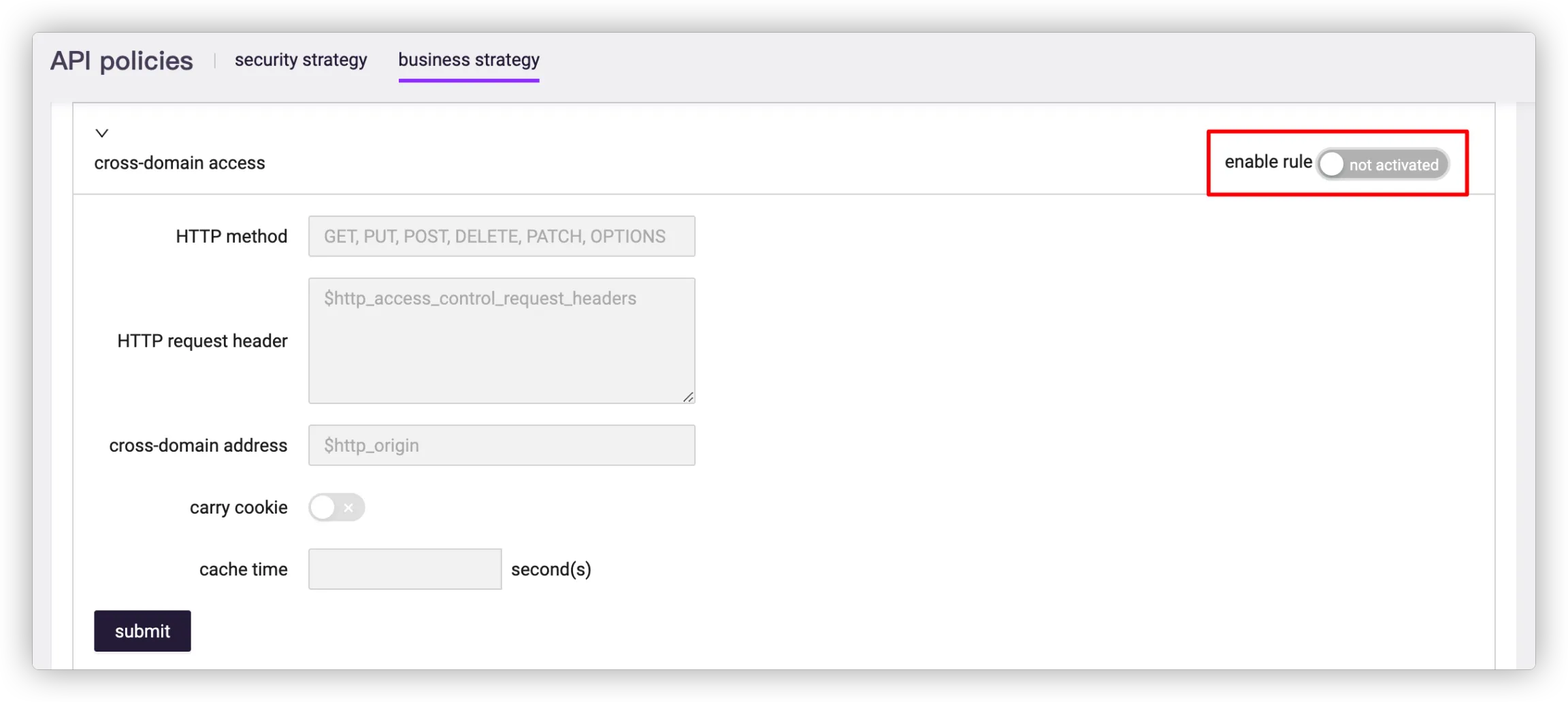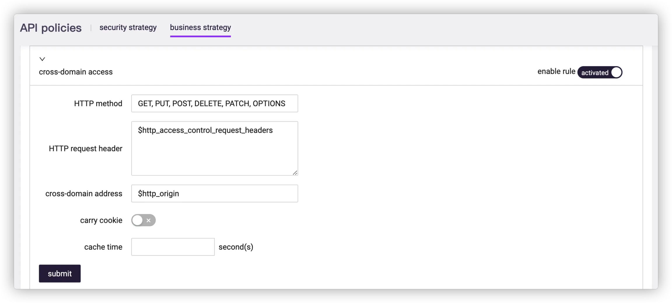 - Strategy for a specific API: Go to Microservice Platform > Select Project > Service Management > API Gateway > Endpoints, select an endpoint, click Details, select an API, and click Strategy > Business Strategy > Cross-Domain Access.