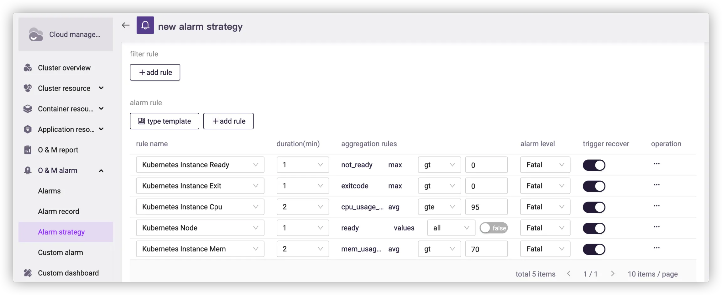 The status of Kubernetes system components is particularly important. The platform will collect information such as events of component exit, thus it is recommended to enable alarm strategies related to Kubernetes.