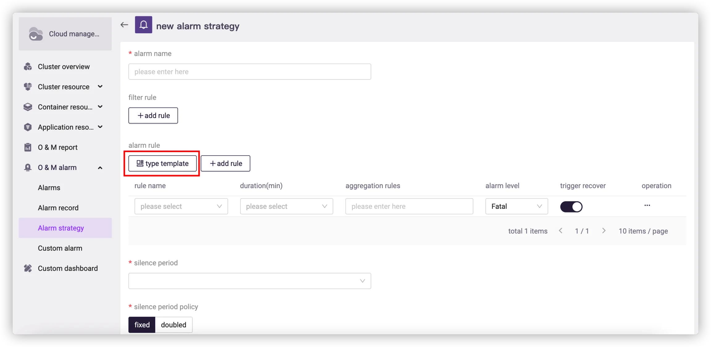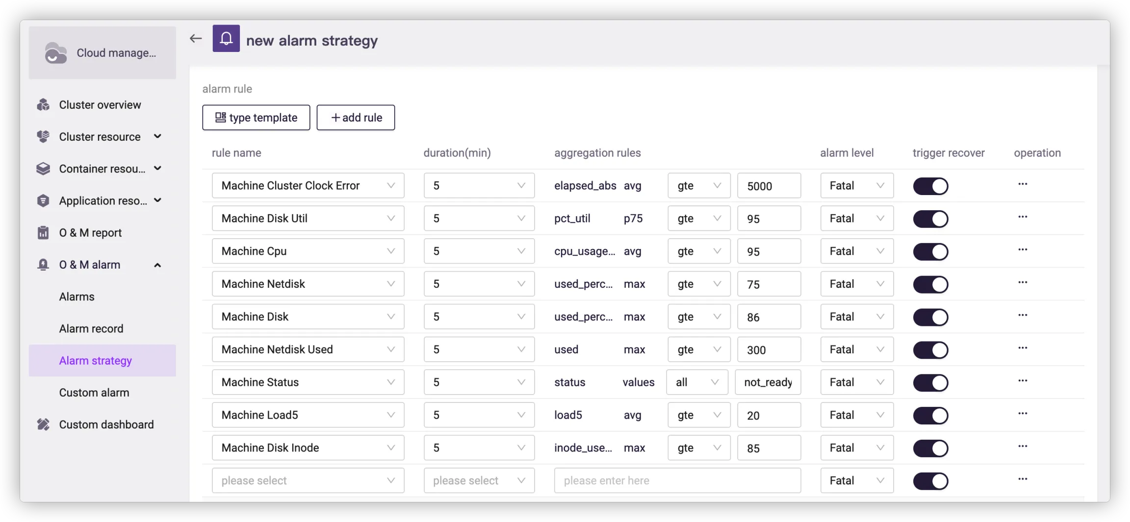 Go to Cloud Management > O&M Alarm > Alarm Strategy > New Strategy. The platform provides multiple built-in alarm strategies and you can select from Type Template as needed.