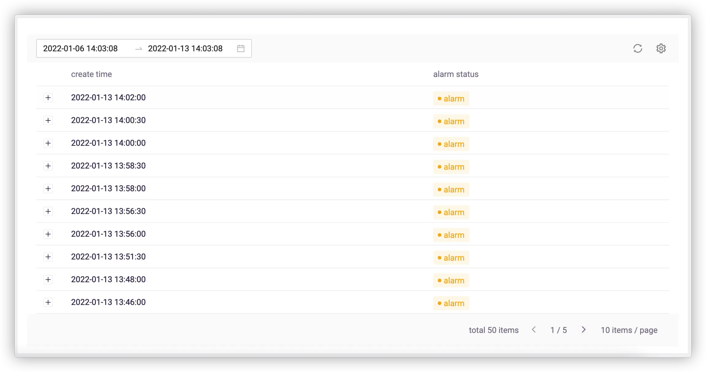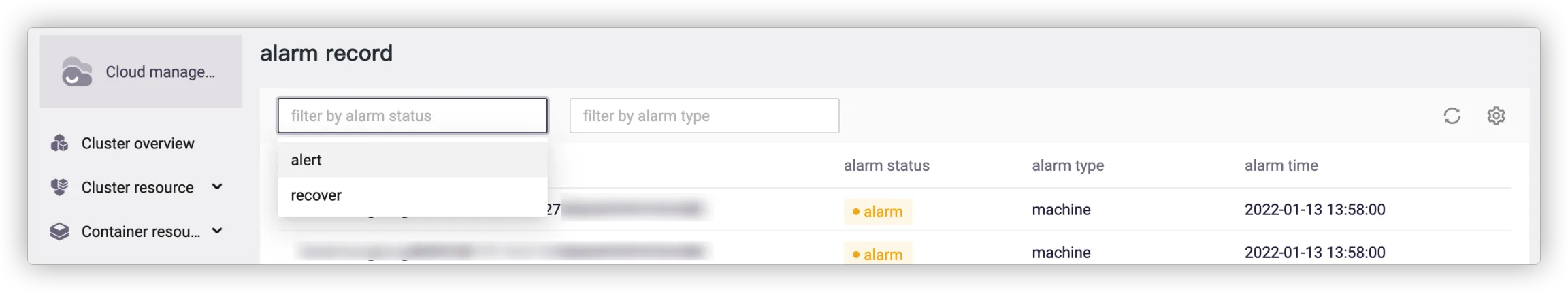 The alarm records are listed in reverse oder of update time. You can filter alarms by alarm status and type.