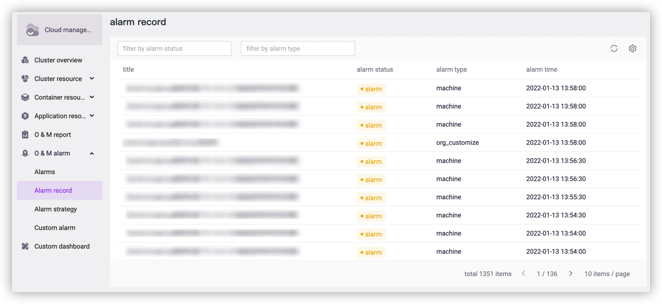 Go to Cloud Management > O&M Alarm > Alarm Record, you can view all the alarm records in the platform.