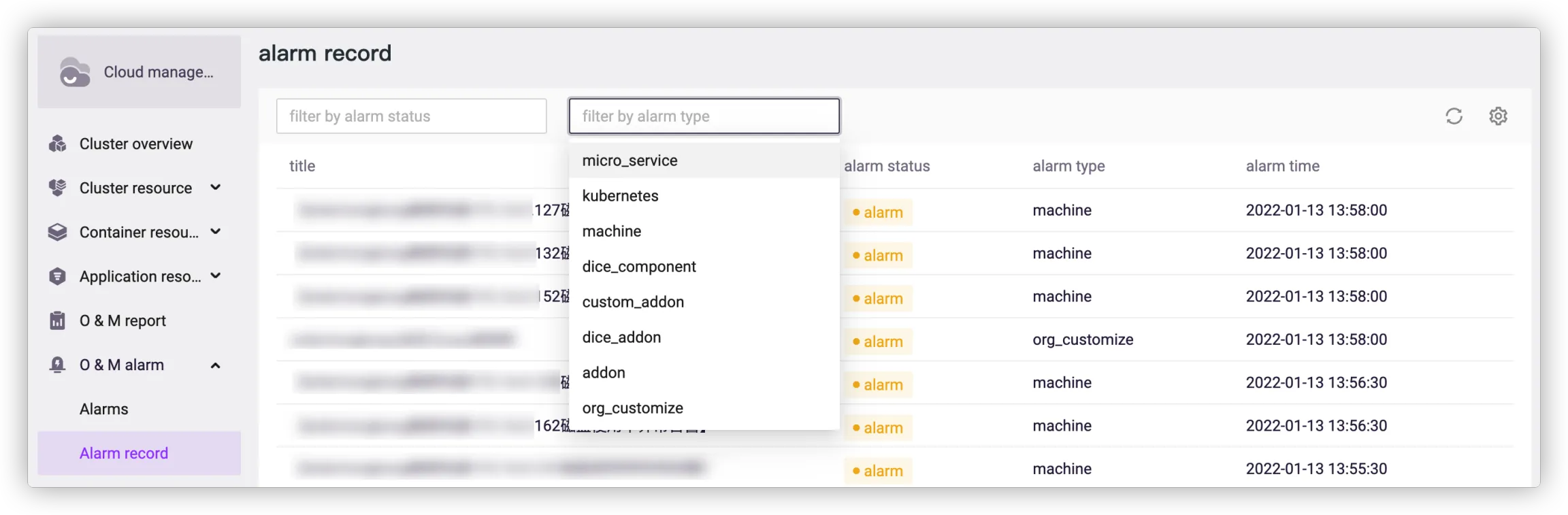 Alarm Type: addon, custom addon, dice addon, component, Kubernetes, machine, microservice, org customize