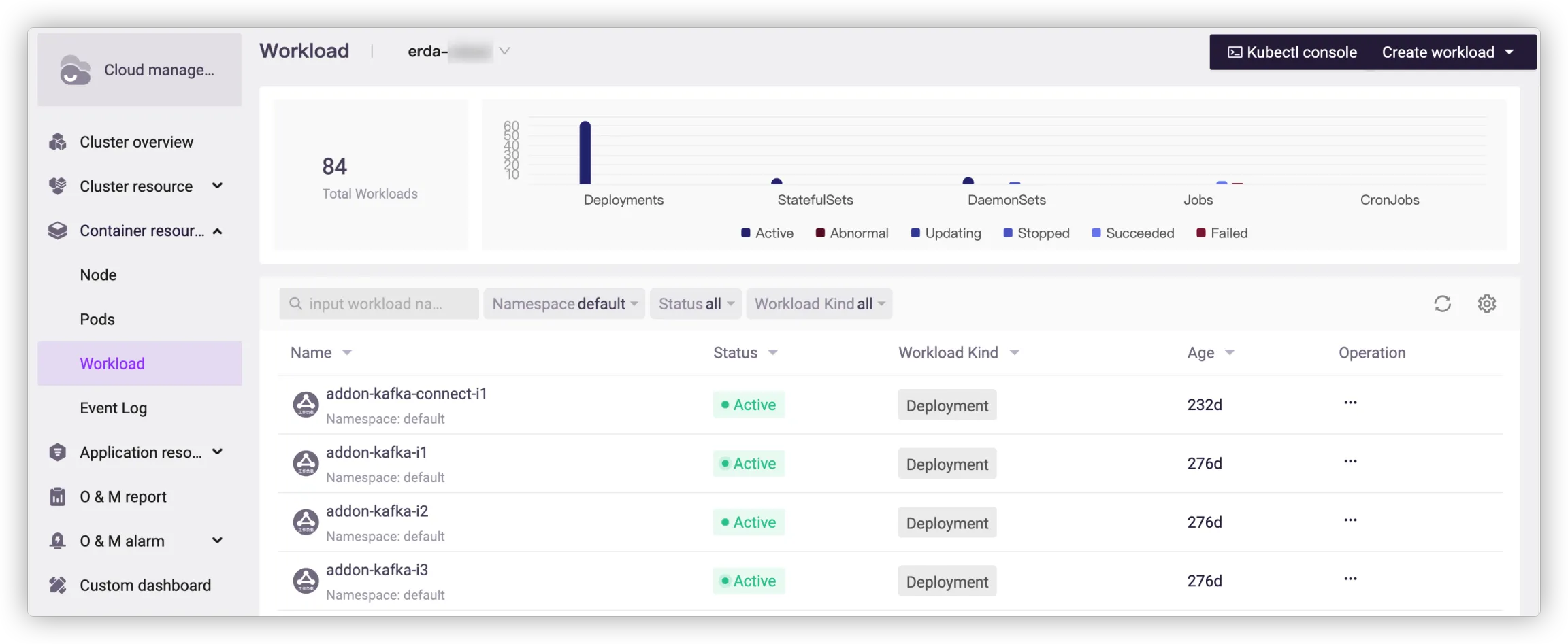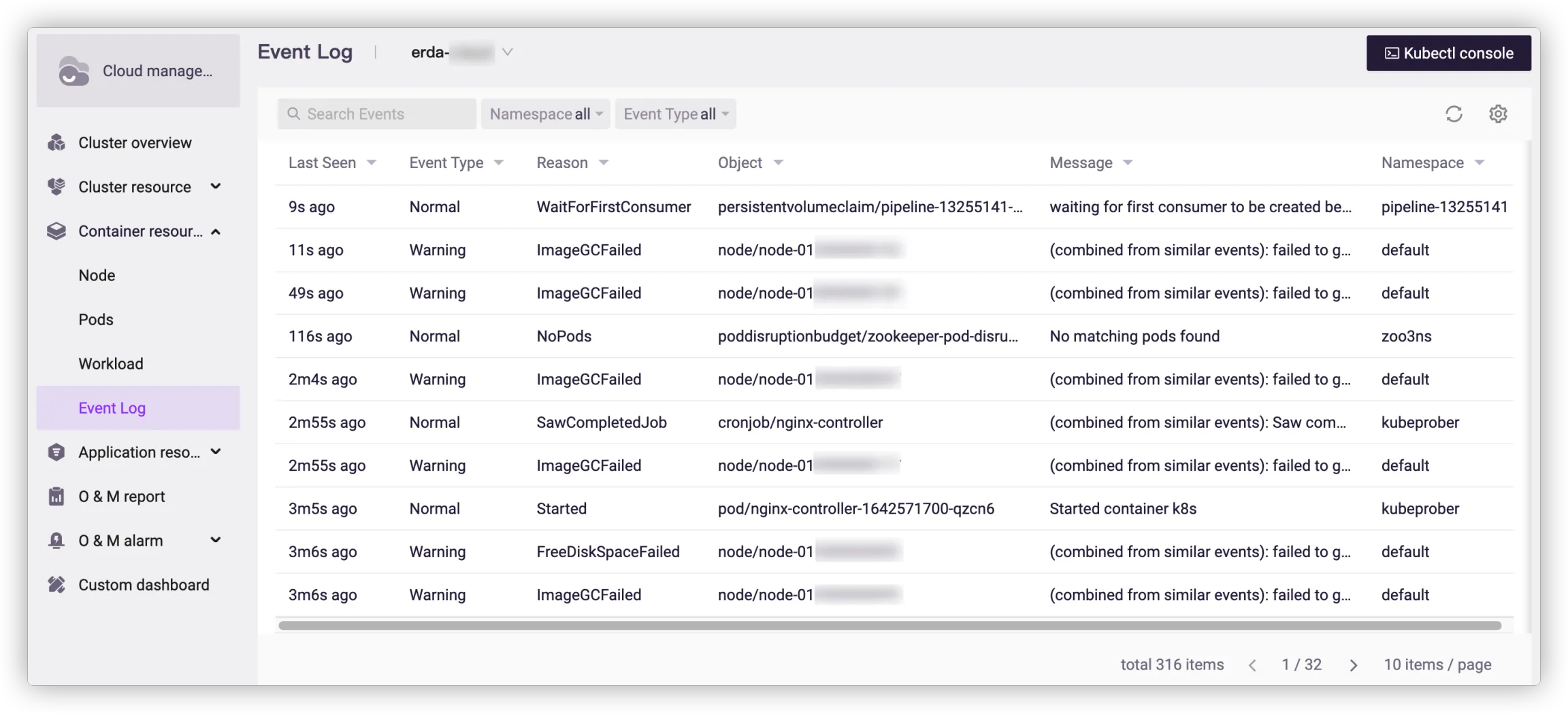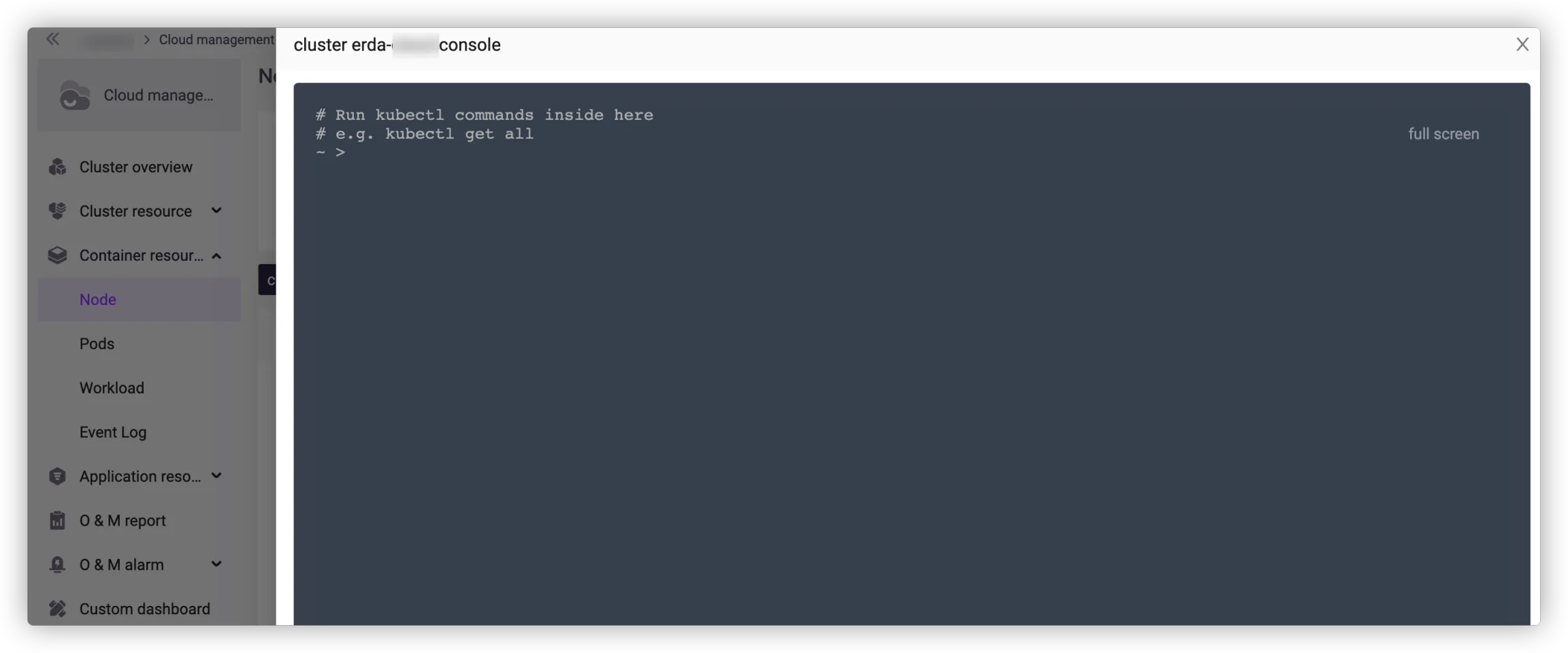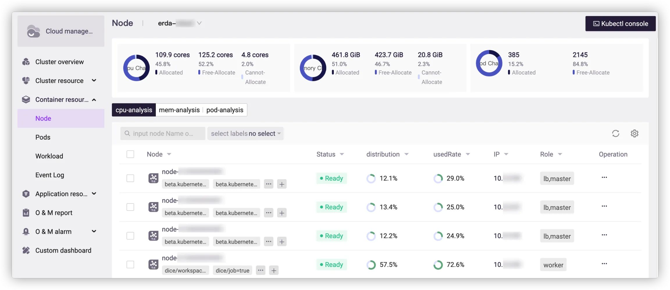 Go to Cloud Management > Container Resource. It shows information such as nodes, pods, workloads and event logs of clusters, and provides the kubectl command line tool with audit features.
