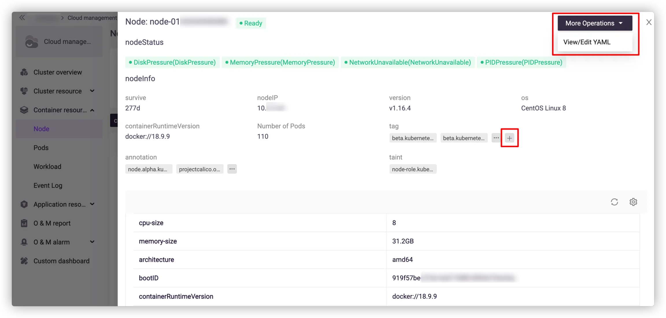 Add or delete tags as needed, or click More Operations > View/Edit YAML in the upper right corner to modify the node's YAML file.