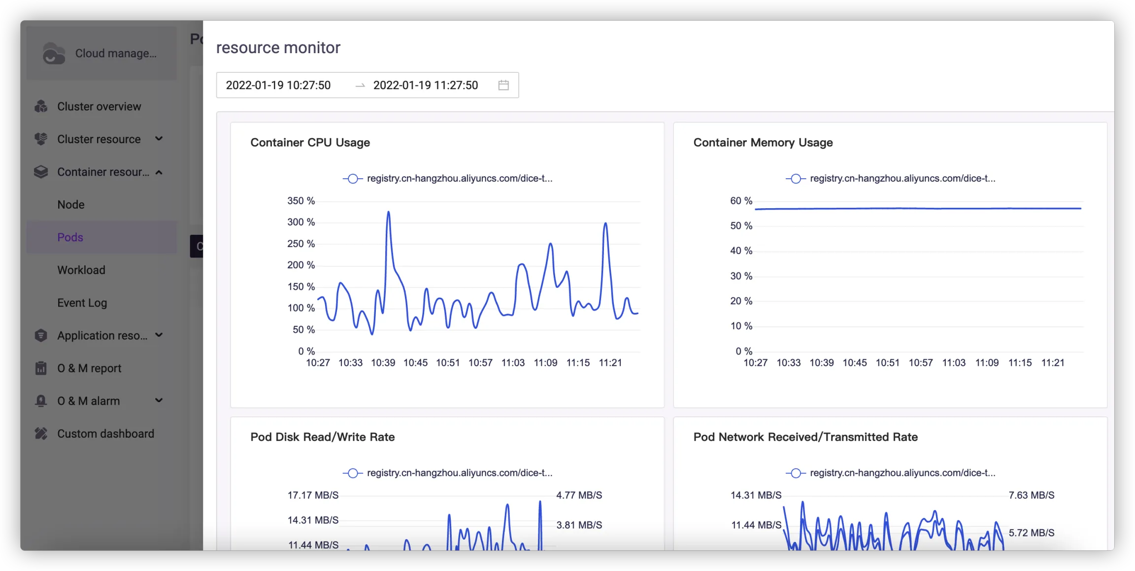 In resource monitoring, you can view the historical operating status of the pod by indicators such as CPU usage, memory usage, disk read and write bytes, and network received and transmitted bytes.