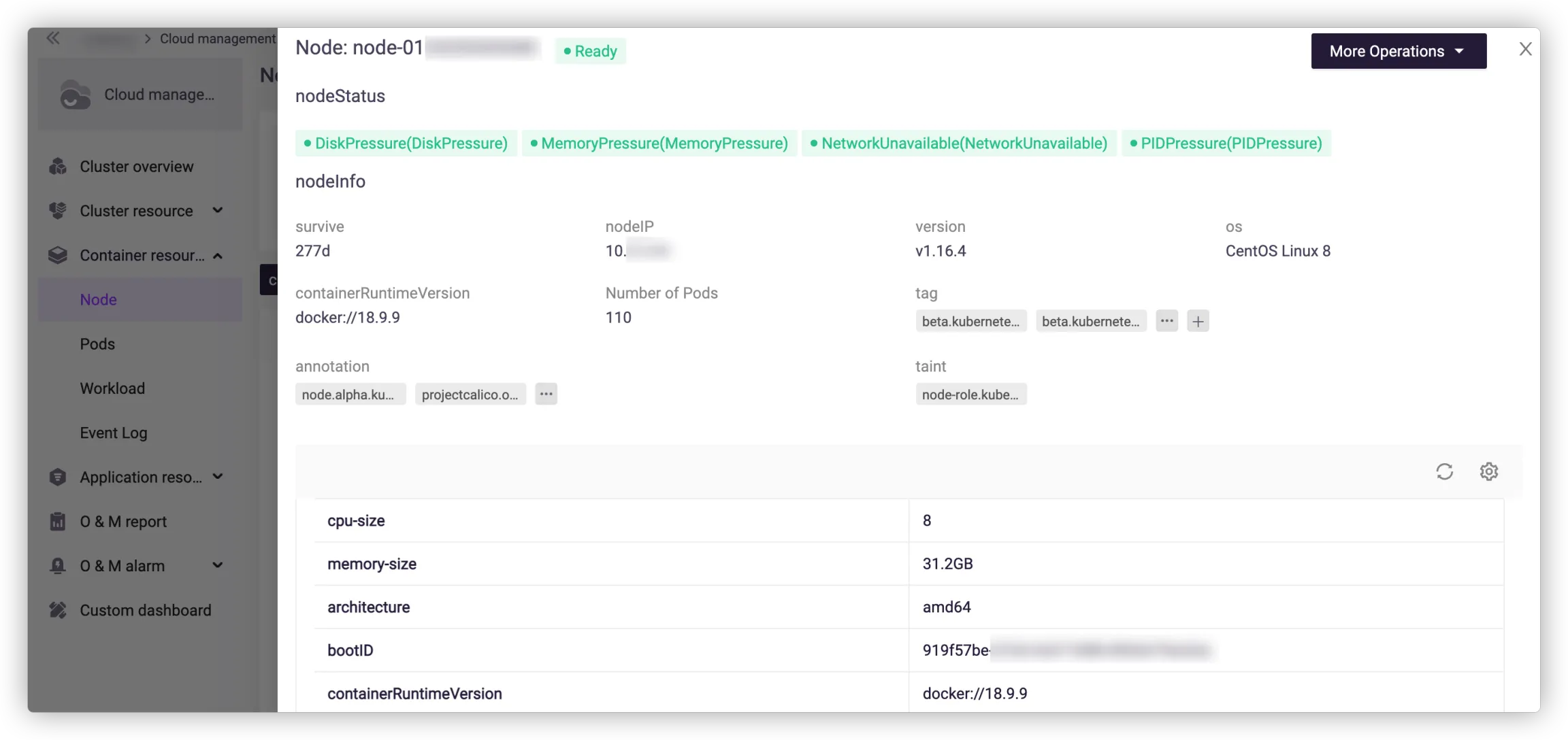 In the column of Operation, you can click Show to go to the pod list page and view information of all pods on the node, which is equal to filtering pods by node name on the pod list page.