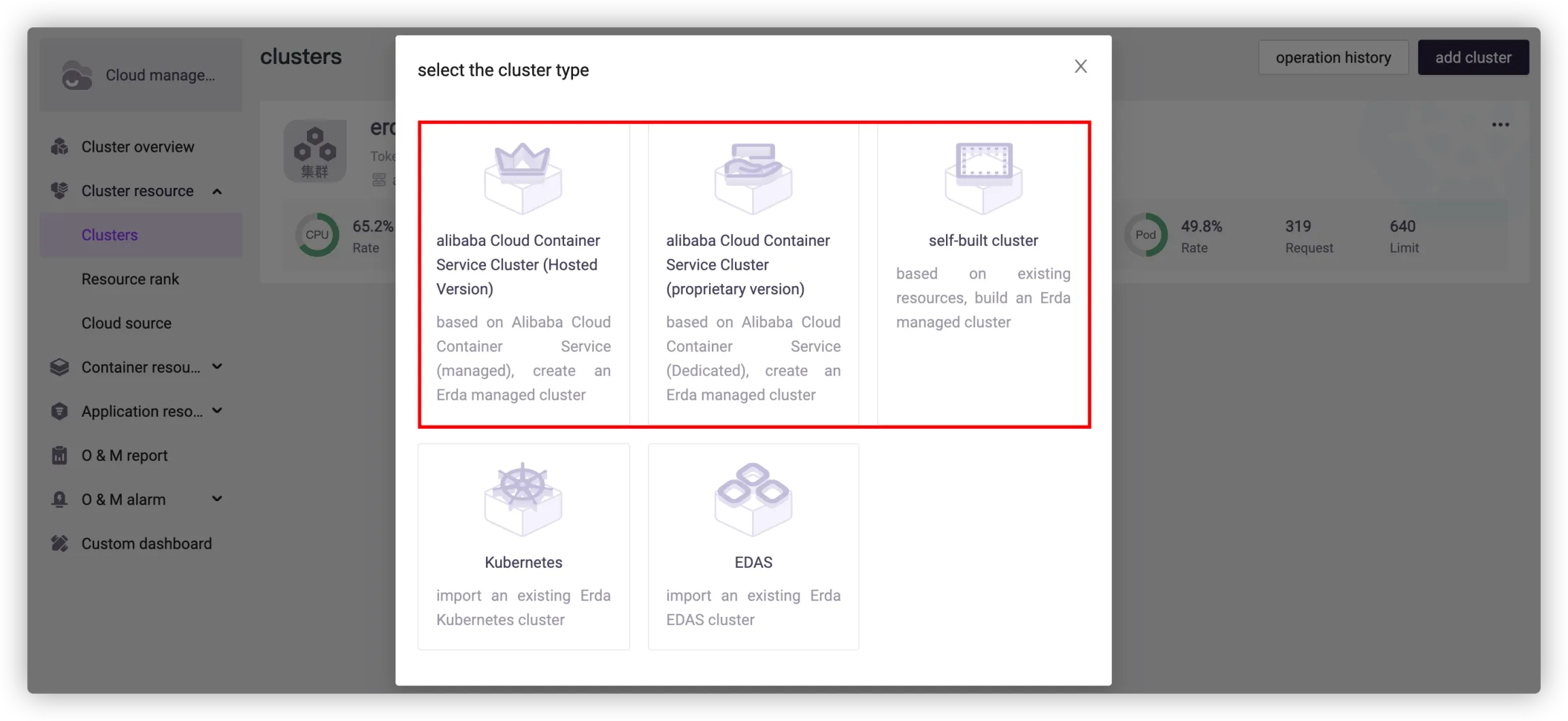 For Alibaba Cloud Container Service for Kubernetes cluster, go to Cloud Management > Cluster Resource > Cloud Source to add an Alibaba Cloud account (including the permissions of Alibaba Cloud Container Service) before creating a cluster, for Alibaba Cloud Container Service purchasing and environment building.
