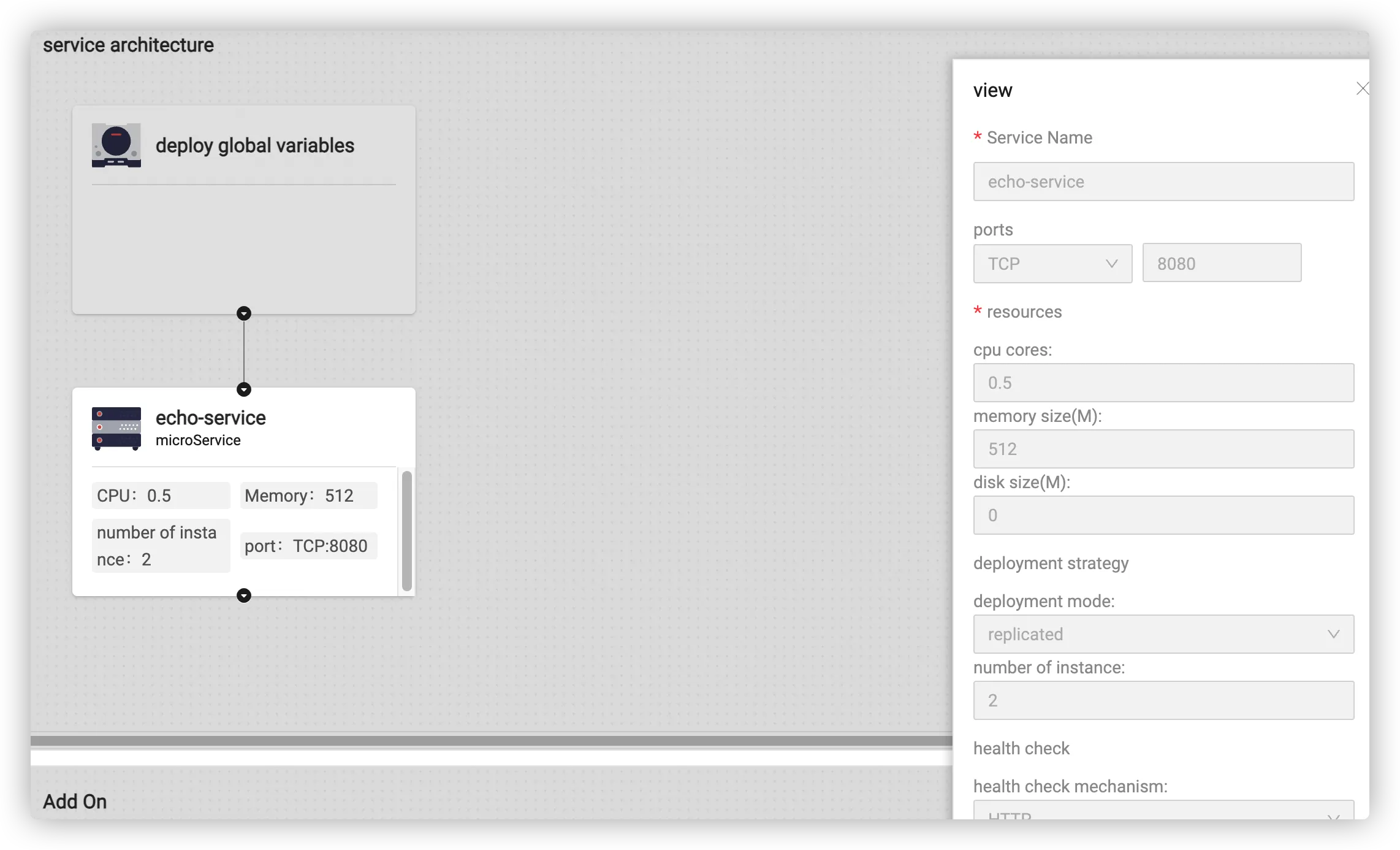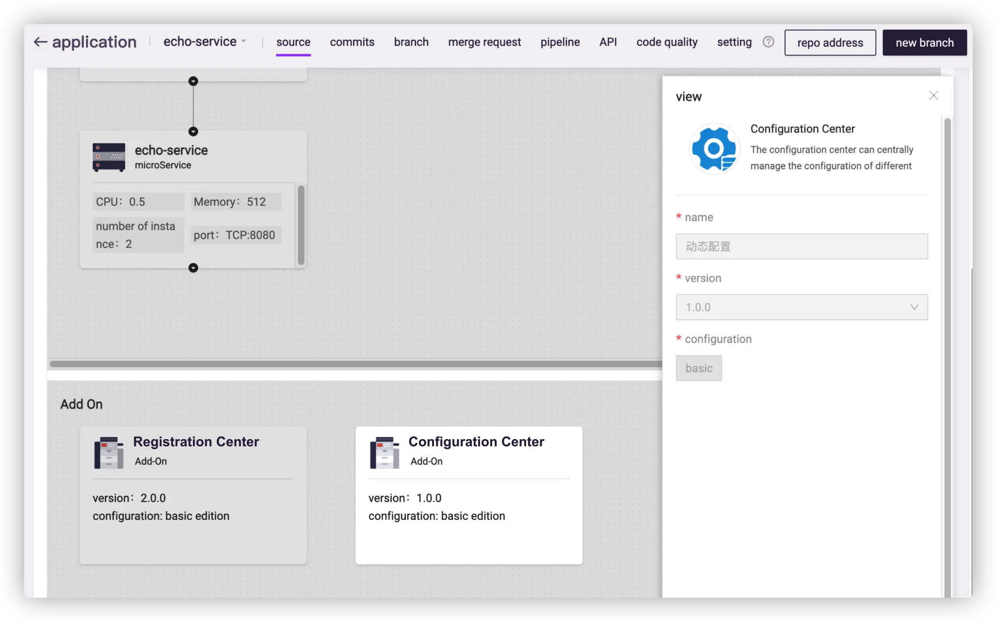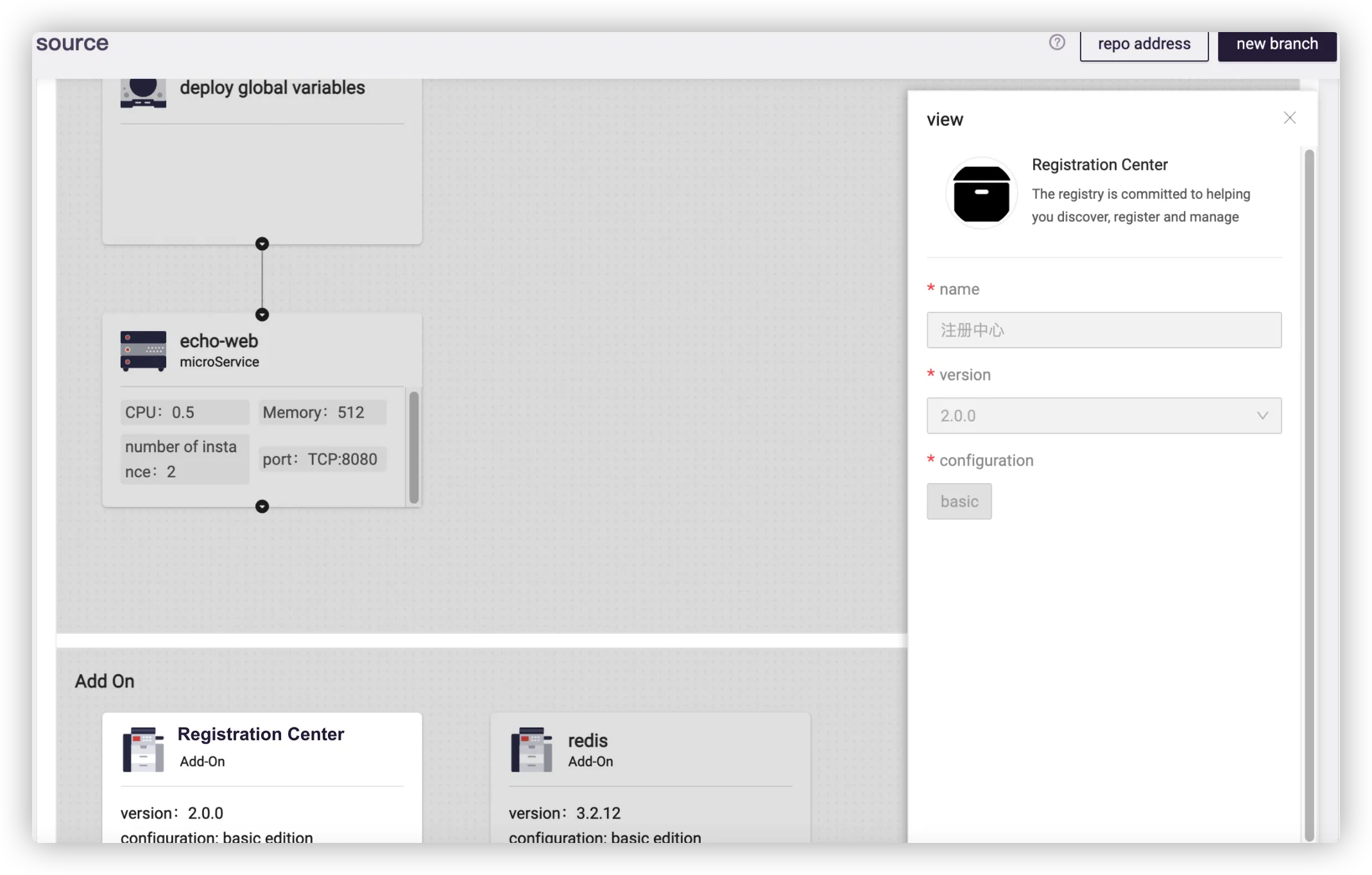 Edit dice.yml of echo-web and echo-service, and add an addon of registration center.