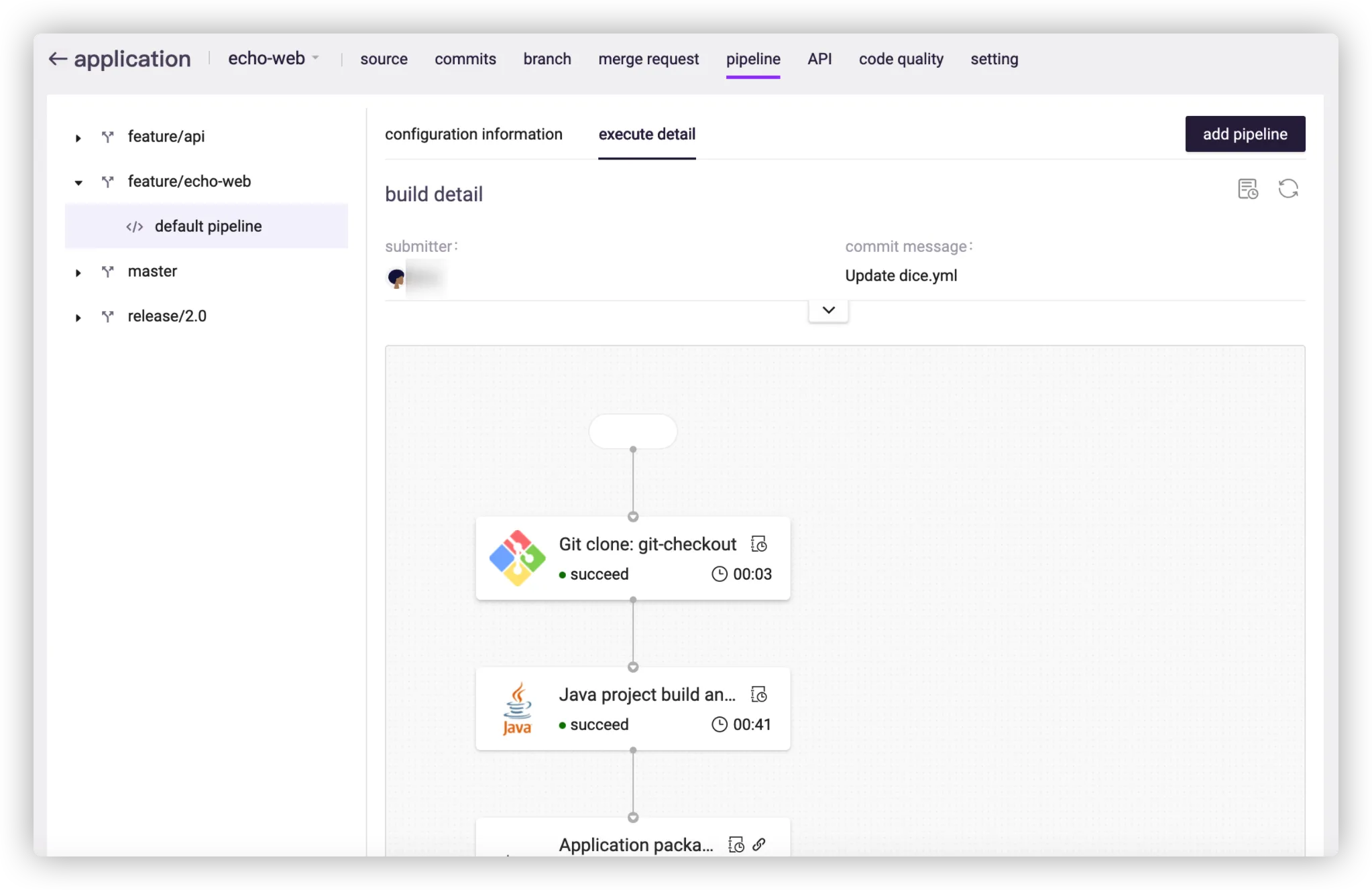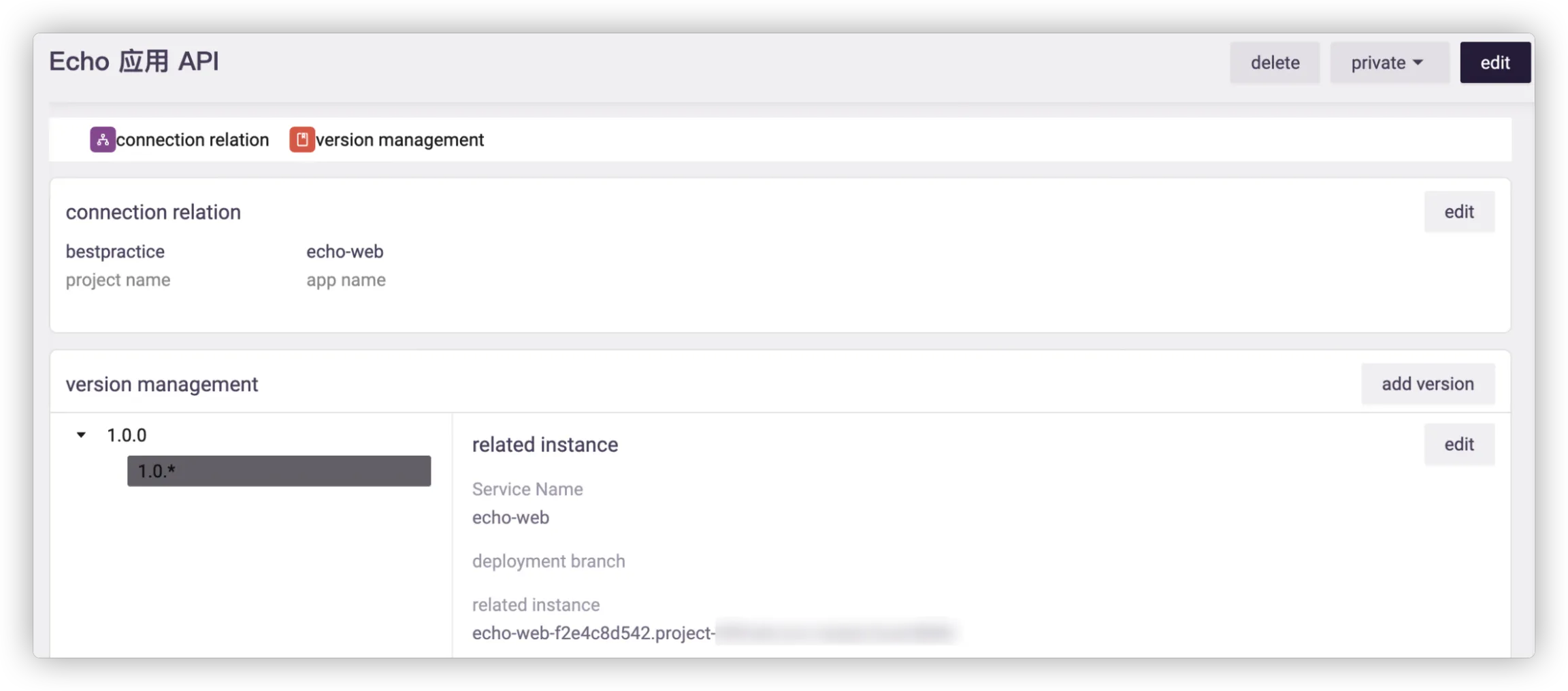 - Version Management: Select the service name as echo-web, the deployment branch as feature/echo-web, and the related instance as echo-web-xxx.svc.cluster.local:8080.