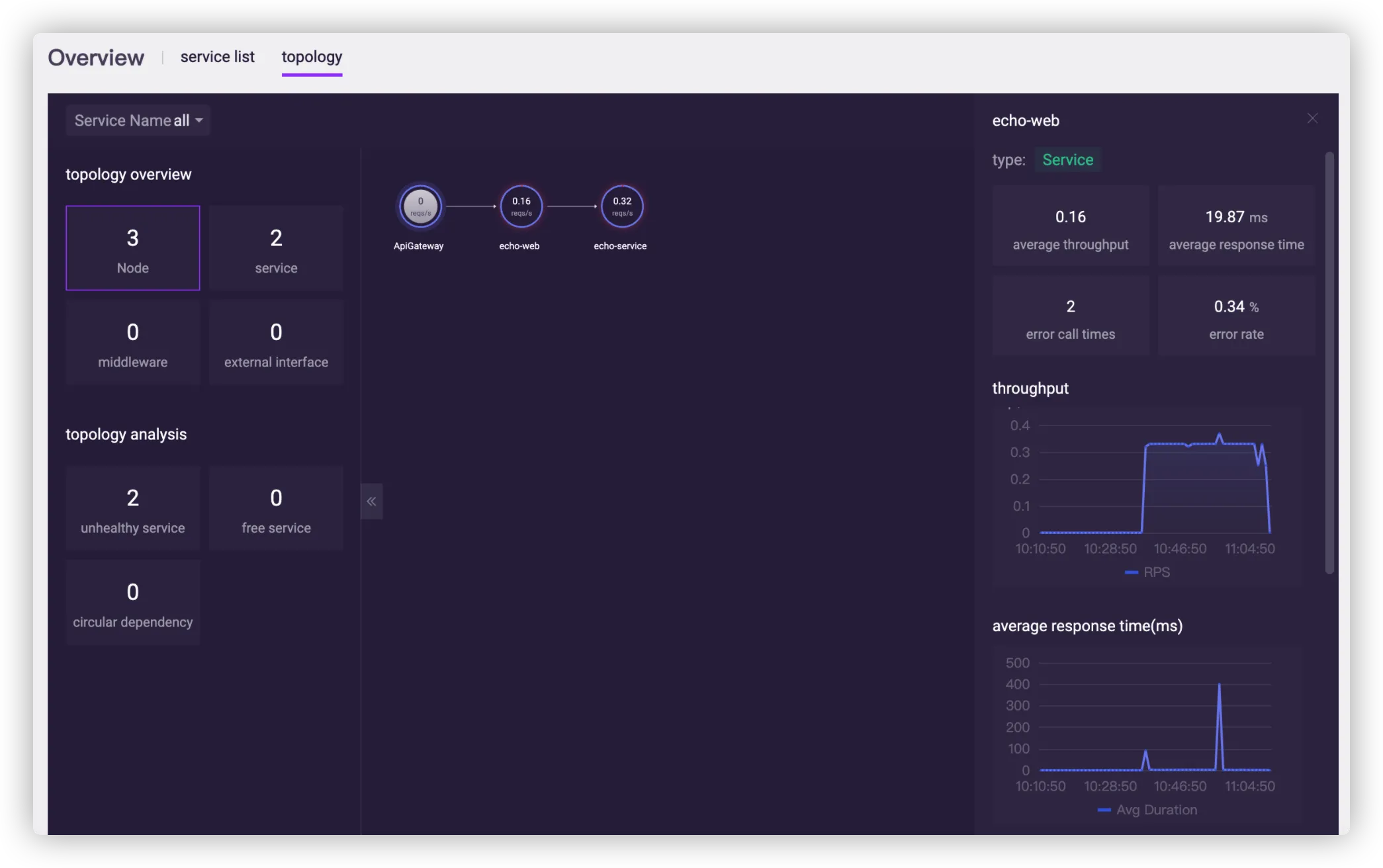 Go to Microservice platform > Overview > Topology, and view the microservice panorama of the project, with exceptions marked in red.