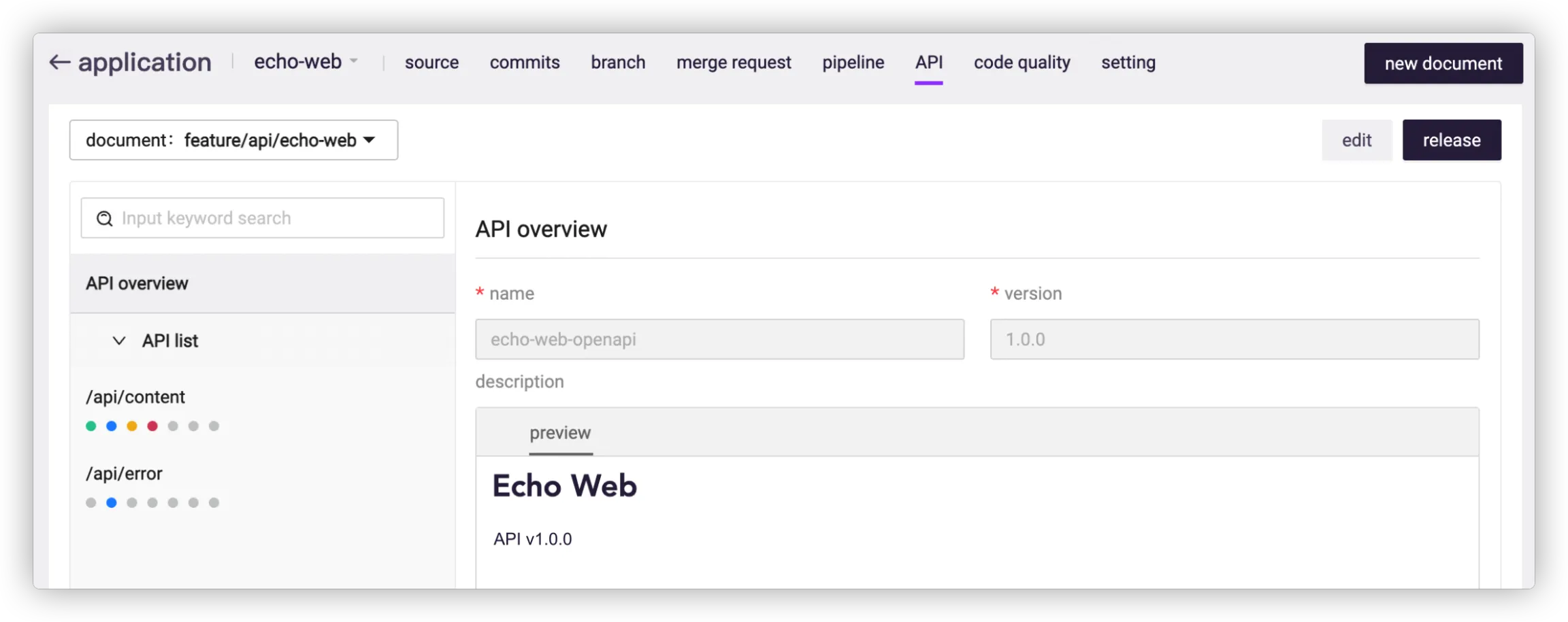 Go to Application of echo-web > API > New Document, select the branch of feature/api and name it echo-web.
