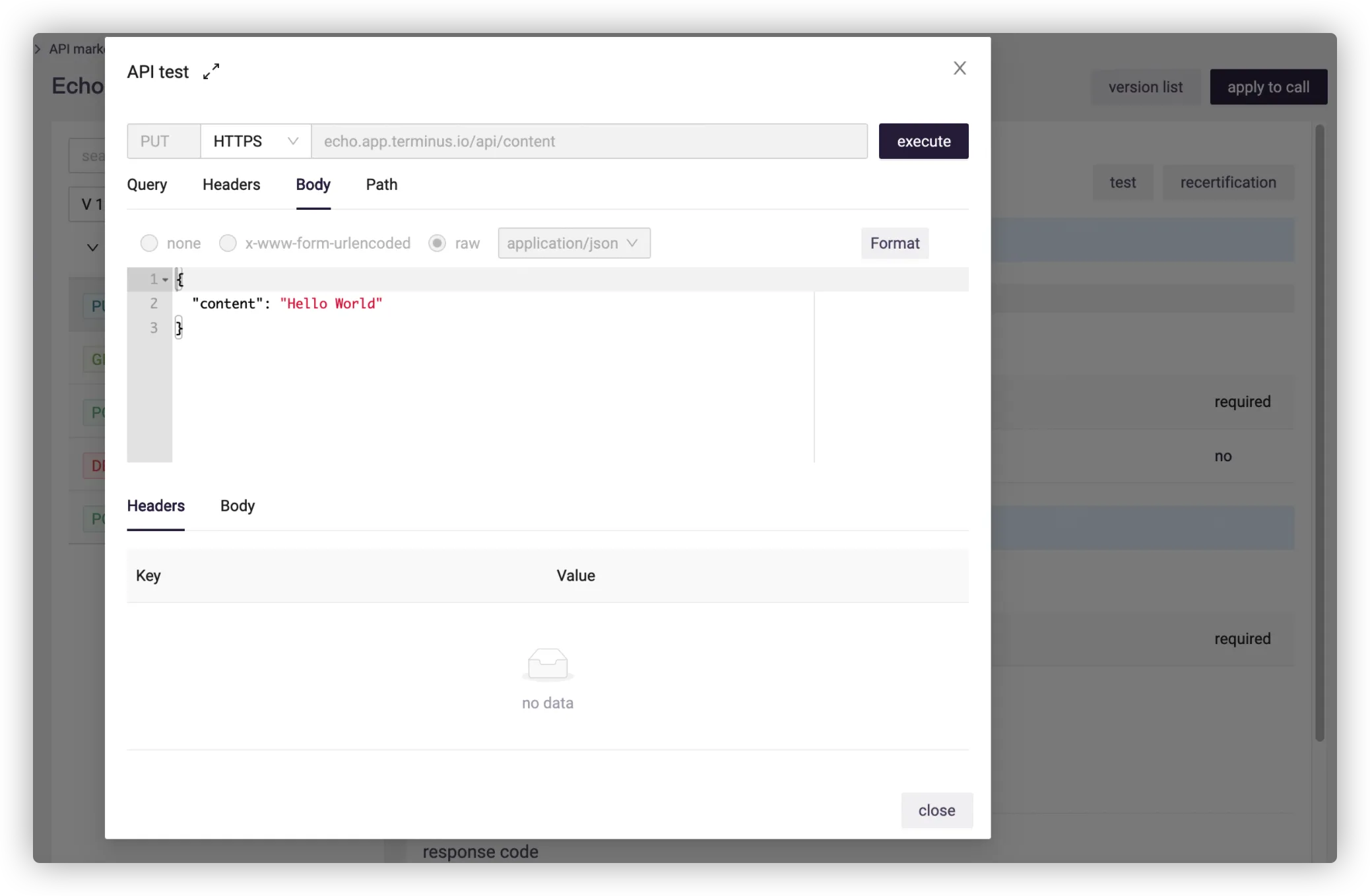 1. /echo/content 1. Method: GET Response MediaType: application/json Type: ContentResponse 2. Method: PUT Body MediaType: application/json Type: ContentRequest 3. Method: POST Body MediaType: application/json Type: ContentRequest 4. Method: DELETE Response MediaType: application/json Type:Object Parameter name: deleted, Type: Boolean 1. /echo/error 1. Method: POST Body MediaType: application/json Type:Object Parameter name: type, Type: StringGo to DevOps Platform > API > API Market to view and manage APIs.