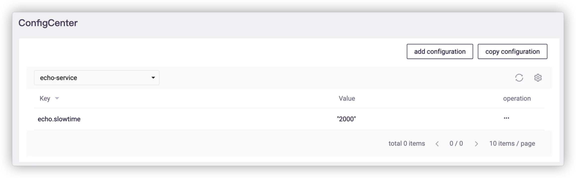 Click Configuration Center in Environments of echo-service, or go to Microservice Platform > Service Management > Config Center to set the value of echo.slowtime: