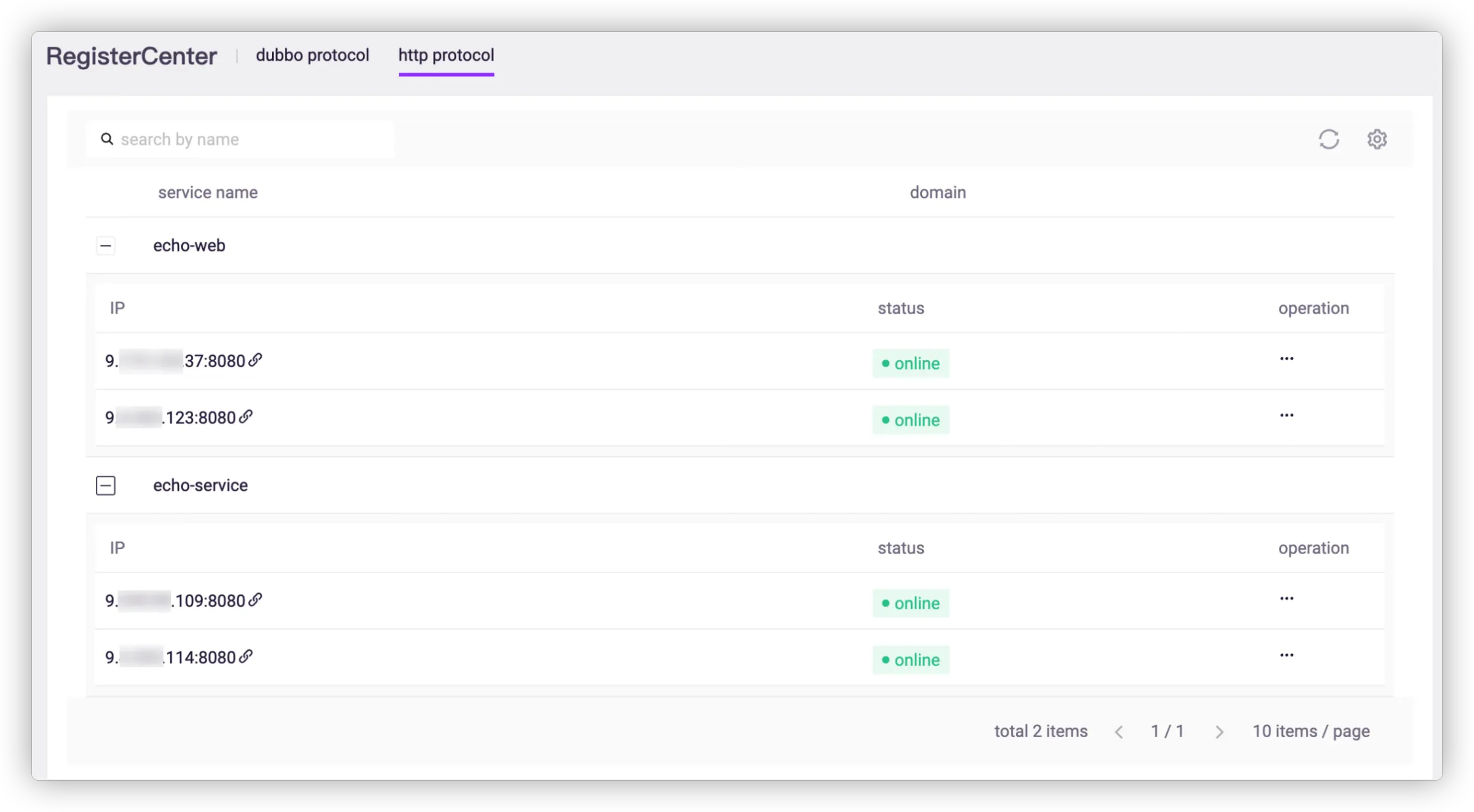 Click Registration Center, or go to Microservice Platform > Service Management > Register Center to view HTTP protocol.