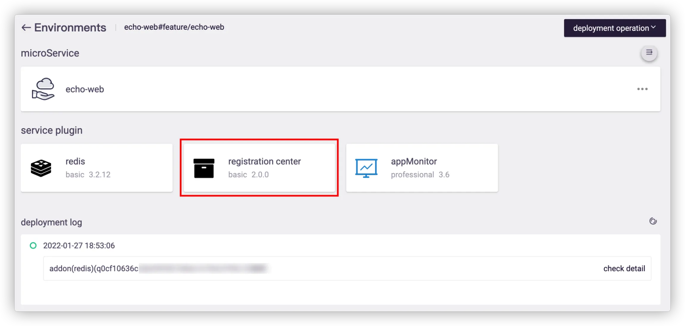 Run pipelines of echo-web and echo-service again, then you can see Registration Center in Environments.