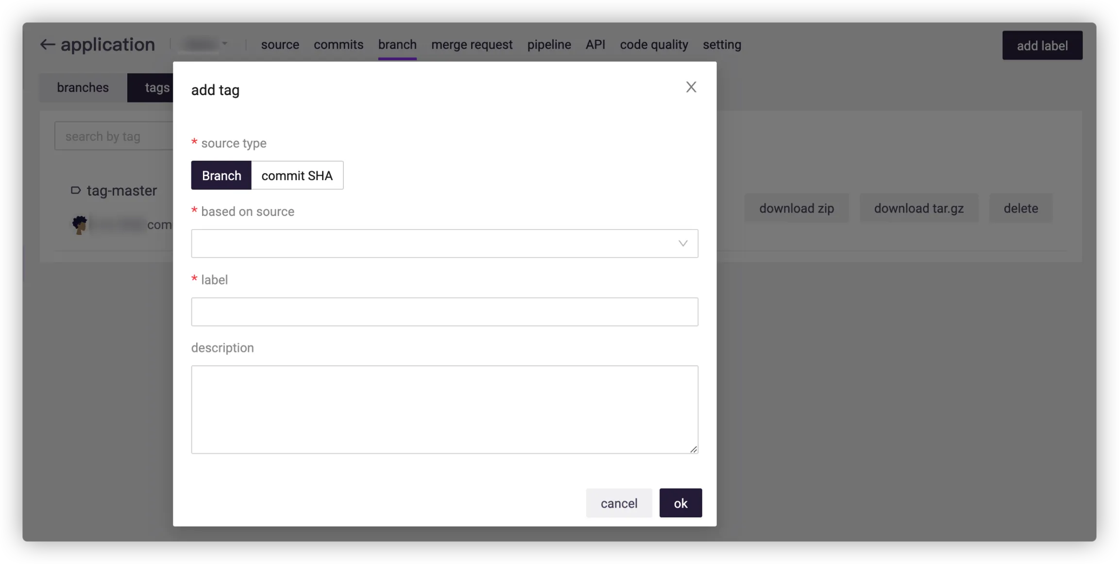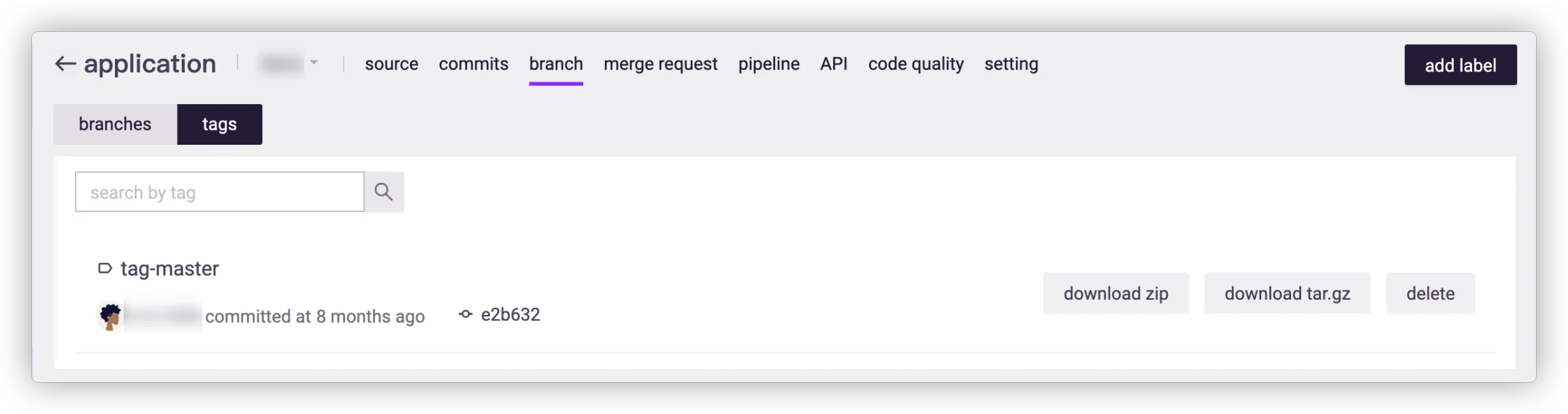 Click Add Label in the upper right corner and select source type of Branch or commit SHA.