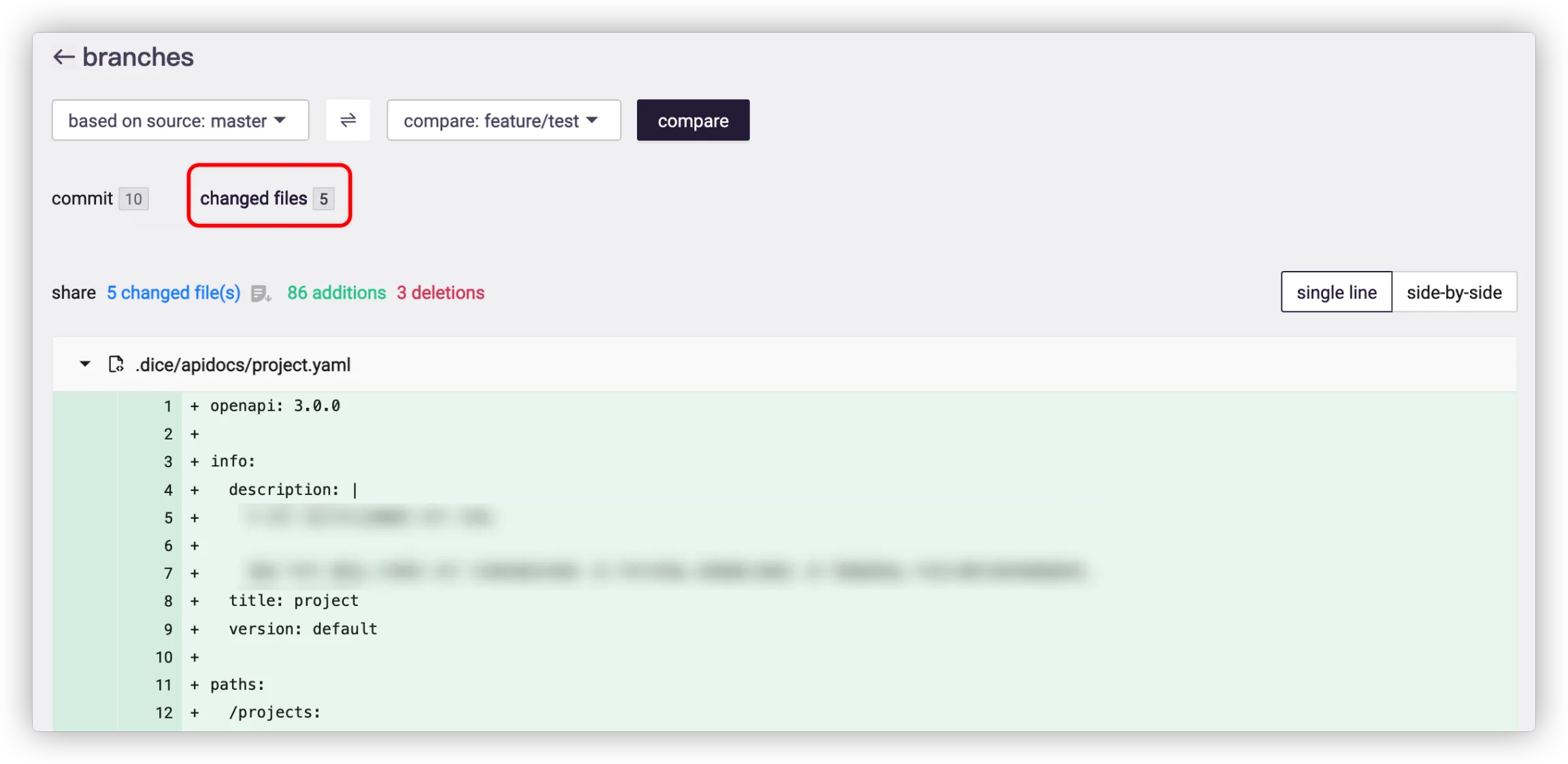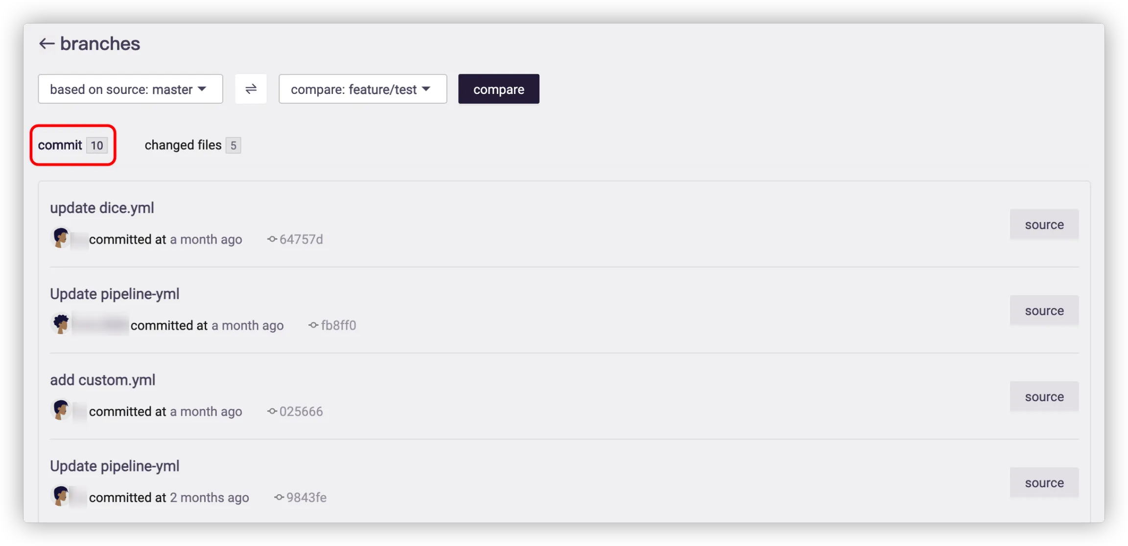 Click Compare to compare the differences between two branches, based on source or target branch. View the commit history of the branch on the current page.