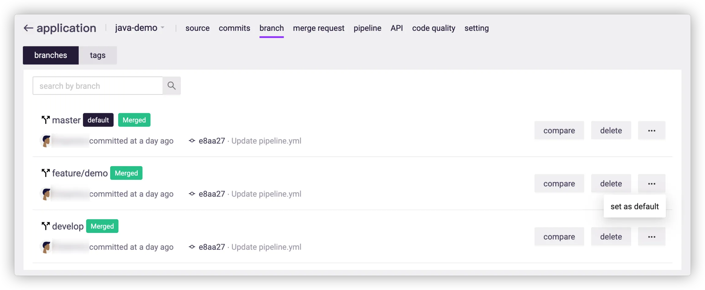 Go to My Application > Select Application > Branch. The repository takes the first branch pushed as default branch by default, which is the target branch for creating a merge request. Click ... to modify.
