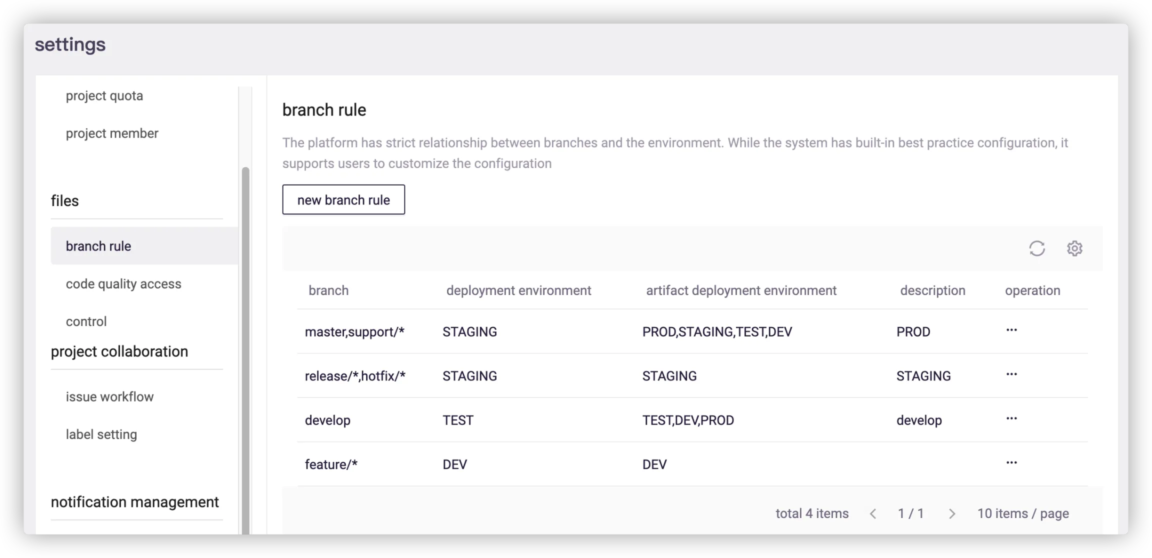 The platform manages branches and environments strictly, with four built-in deployment environments: DEV, TEST, STAGING and PROD. It provides built-in configurations of best practices and also supports customization. For more information on branch management, see Gitflow.