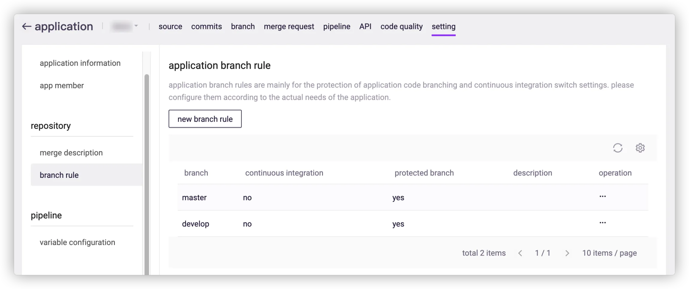 Branch protection: Once enabled, only the application owner and leader can operate, and other members need to submit codes by MR.