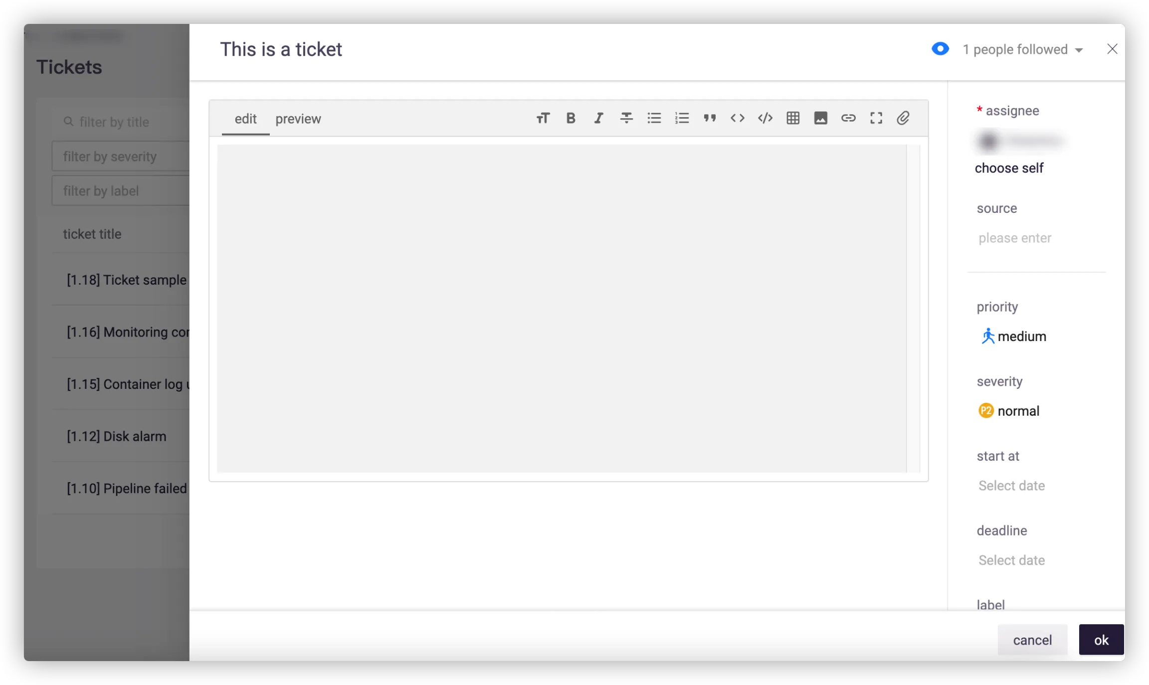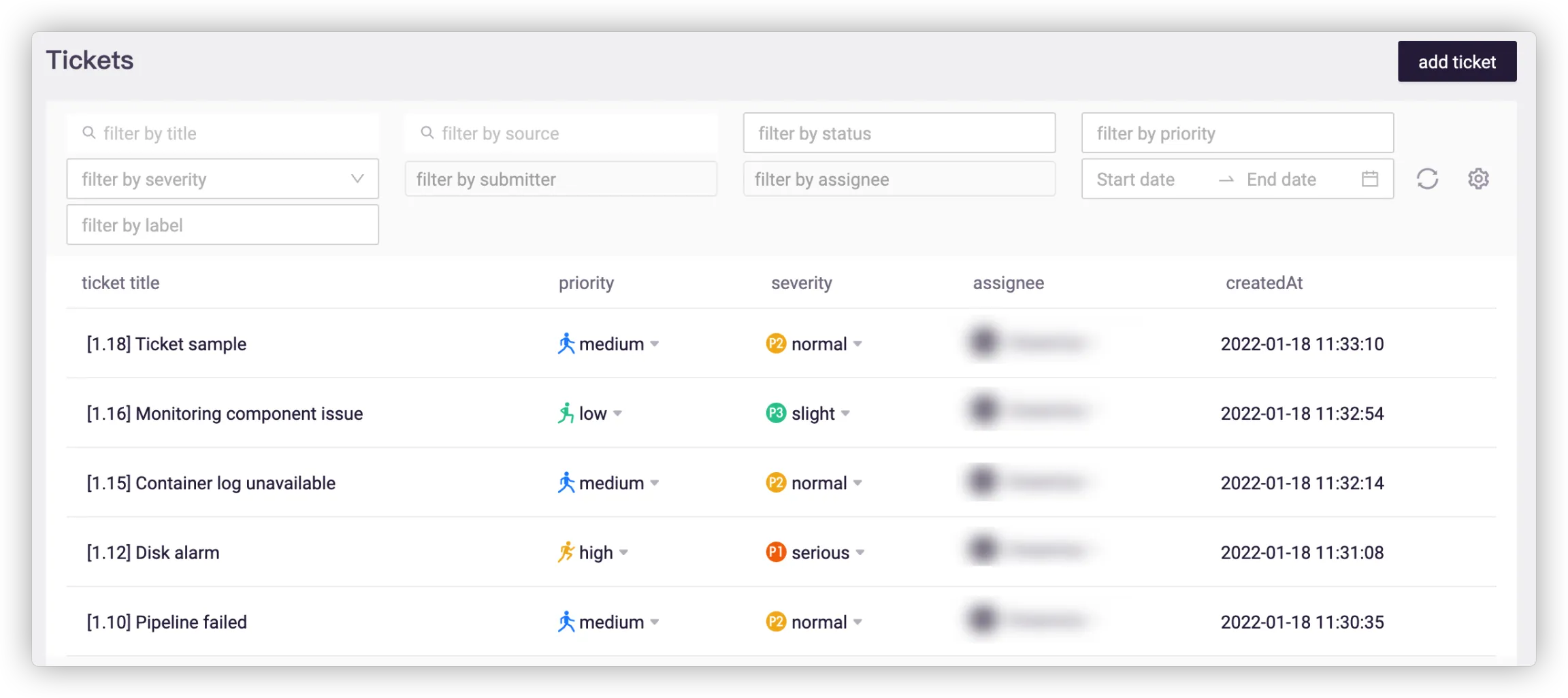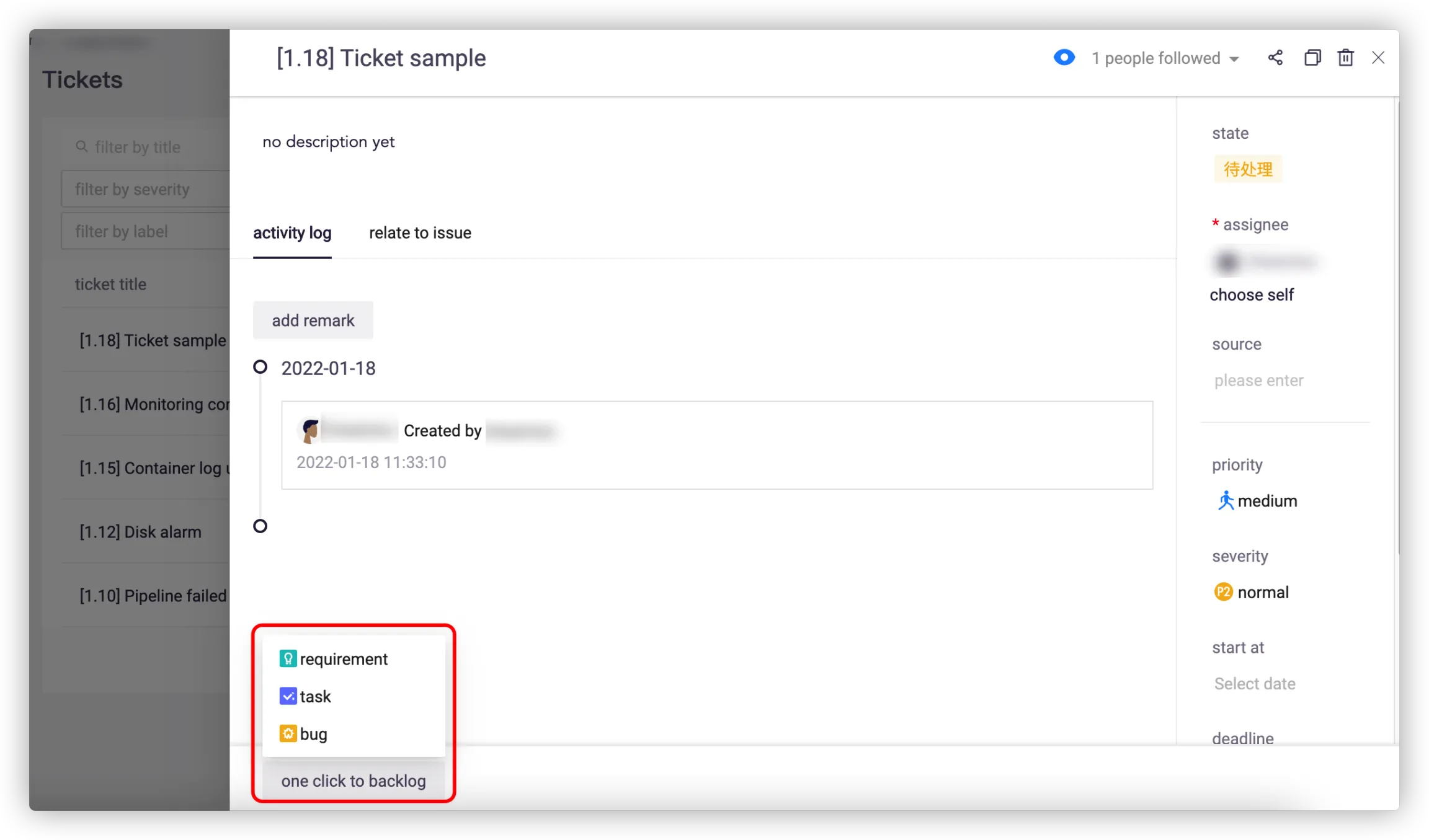 Click Add Ticket in the upper right corner, and fill in the information such as ticket name, details, assignee, priority, severity, deadline and label.