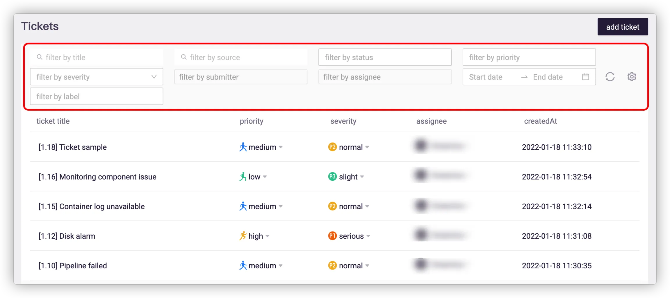 The tickets can be filtered by multiple conditions, such as title, status, priority, severity and submitter.