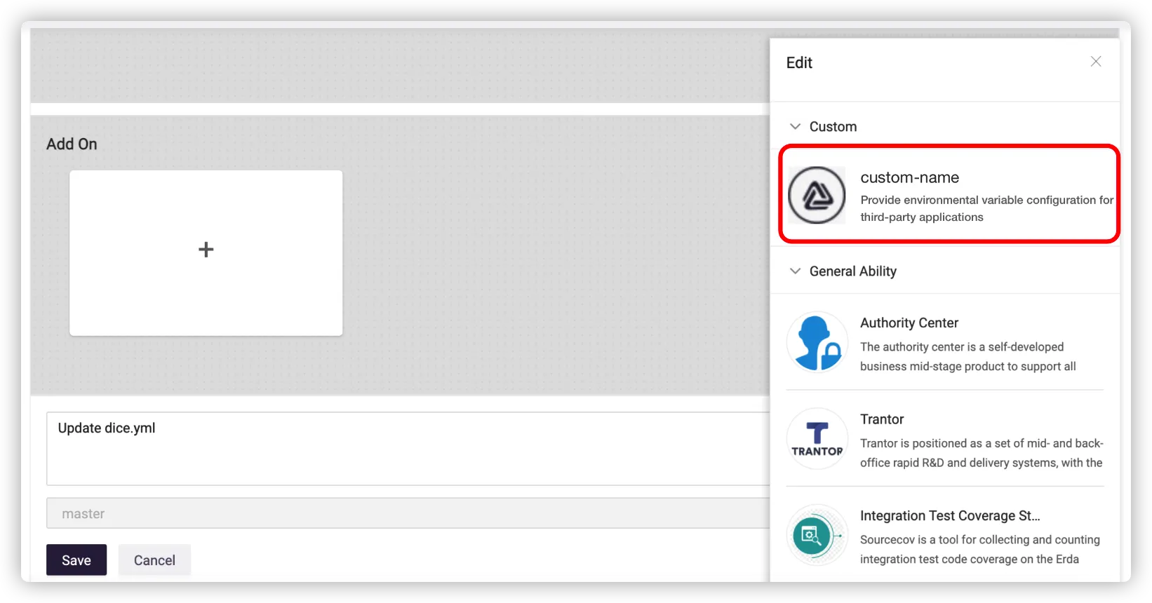 Go to Apps > Code, edit the erda.yml and select the previously created addon.