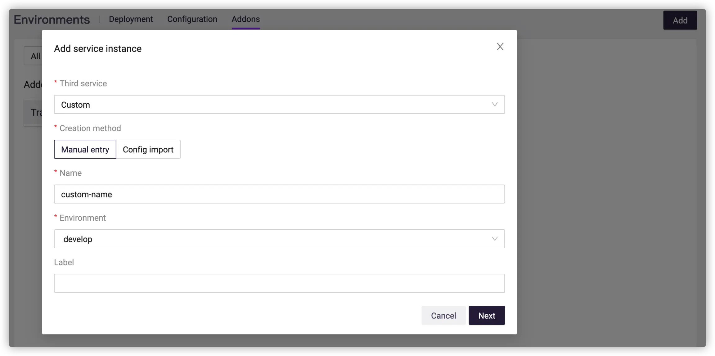 Go to DevOps Platform > Projects > App Center > Environments > Addons, click Add, and select Custom for Third service.