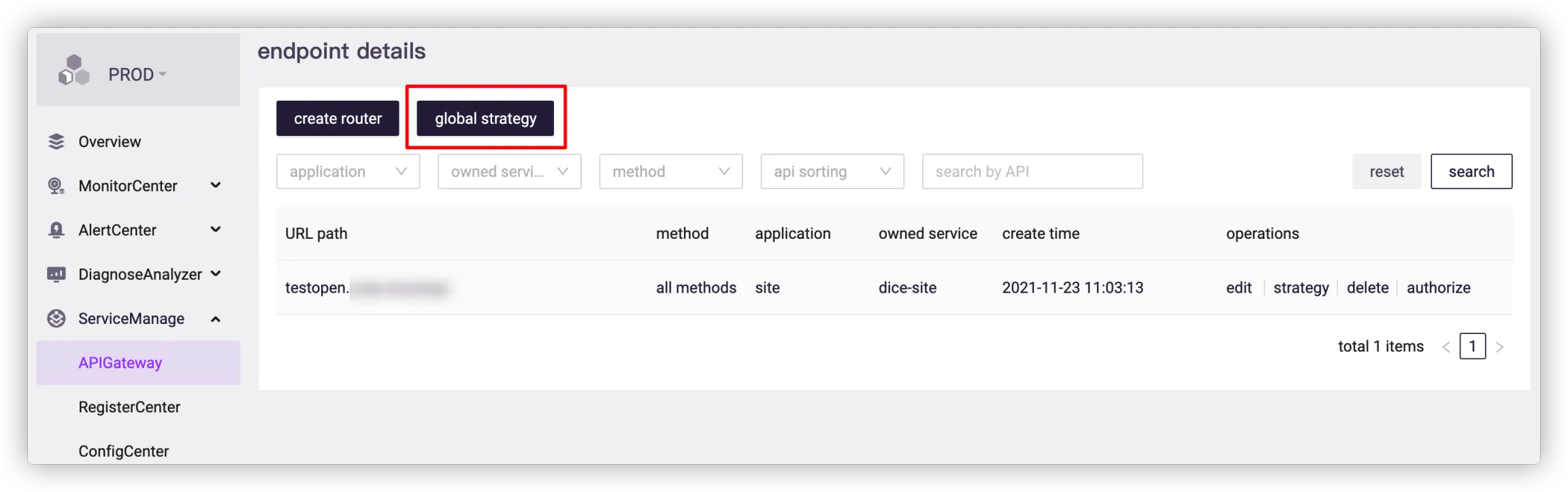 Go to Microservice Platform > Service Management > API Gateway > Endpoints, select an endpoint and click Global Strategy.