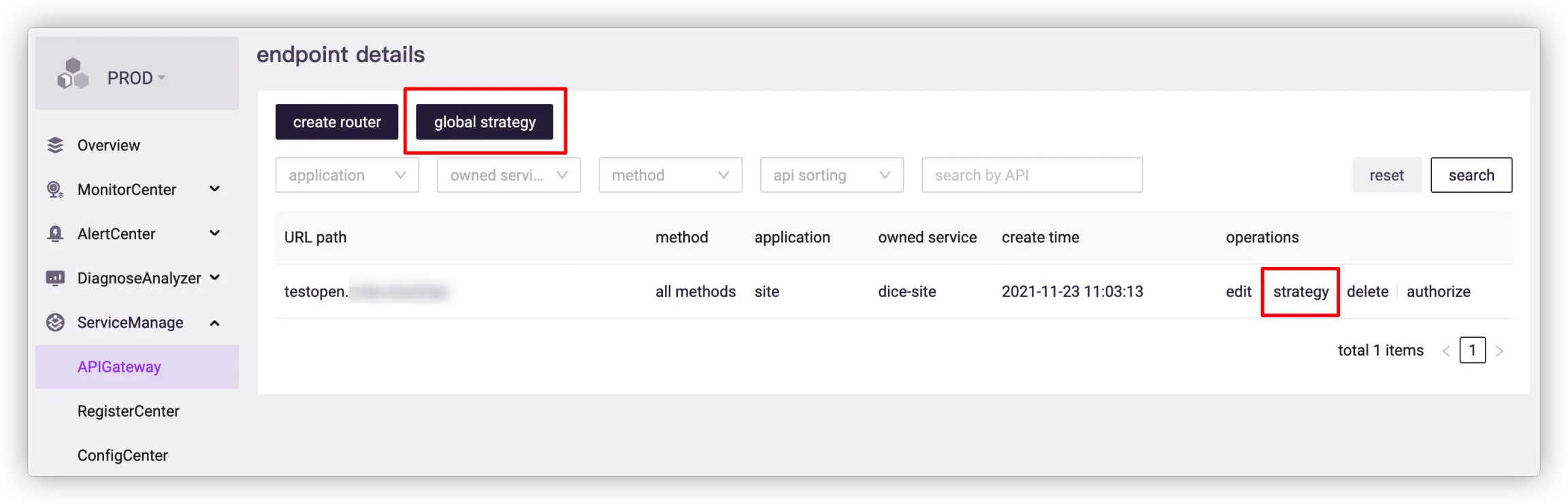 Go to Microservice Platform > Service Management > API Gateway > Endpoints, select an endpoint and click Global Strategy or Strategy. (The global strategy is effective for all APIs in the endpoint, and the specific API strategy is only effective for this API.)