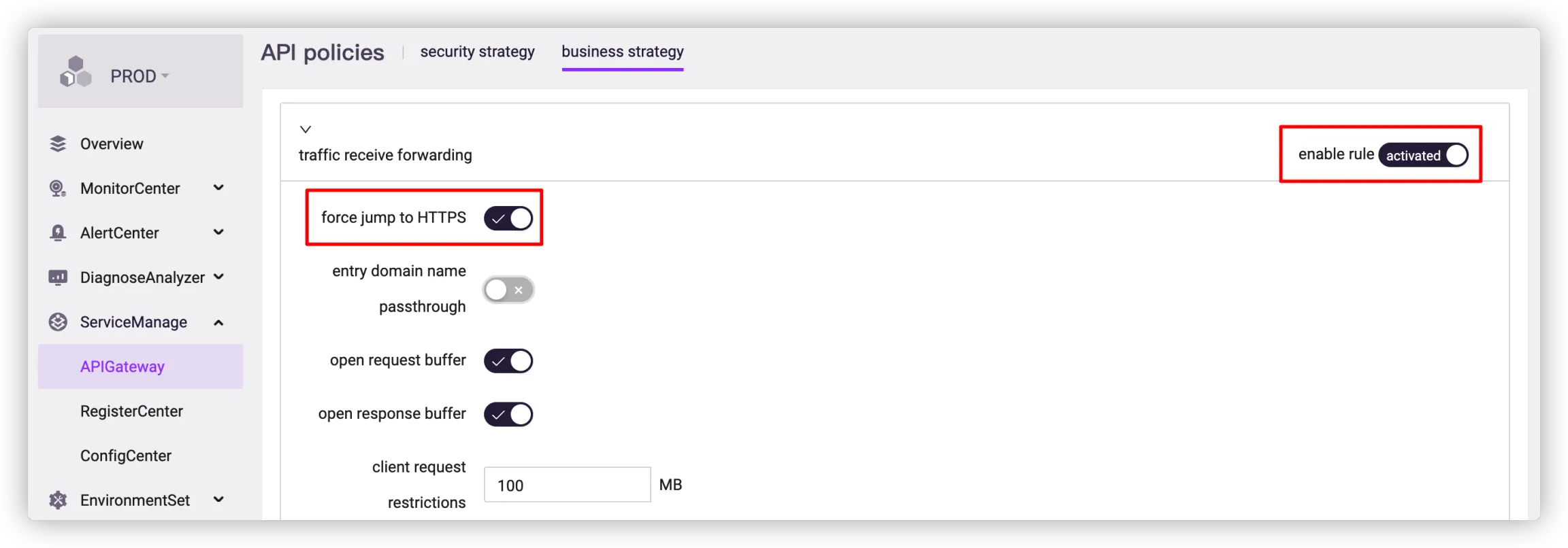 Go to Business Strategy > Traffic Receiving and Forwarding, enable the rule and turn on Force Jump to HTTPS.