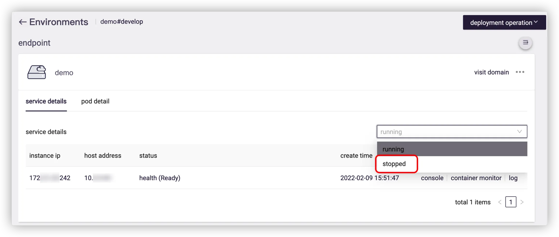 Go to DevOps Platform > Projects > App Center > Environments, select a runtime and select Stopped to view the corresponding container instance.