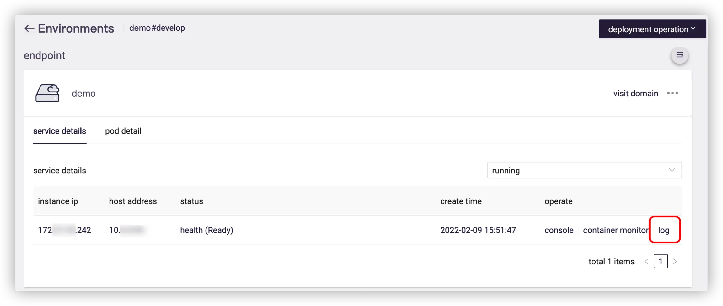 Go to DevOps Platform > Projects > App Center > Environments and select a runtime to view the container log, which shows the standard output (stdout) log. For details, see Service Log.