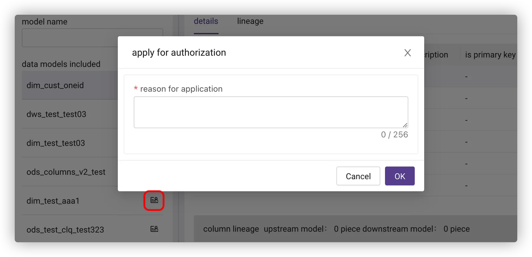 - Go to Data Governance > Workflow Table and click the icon on the right of the model to apply for authorization.
