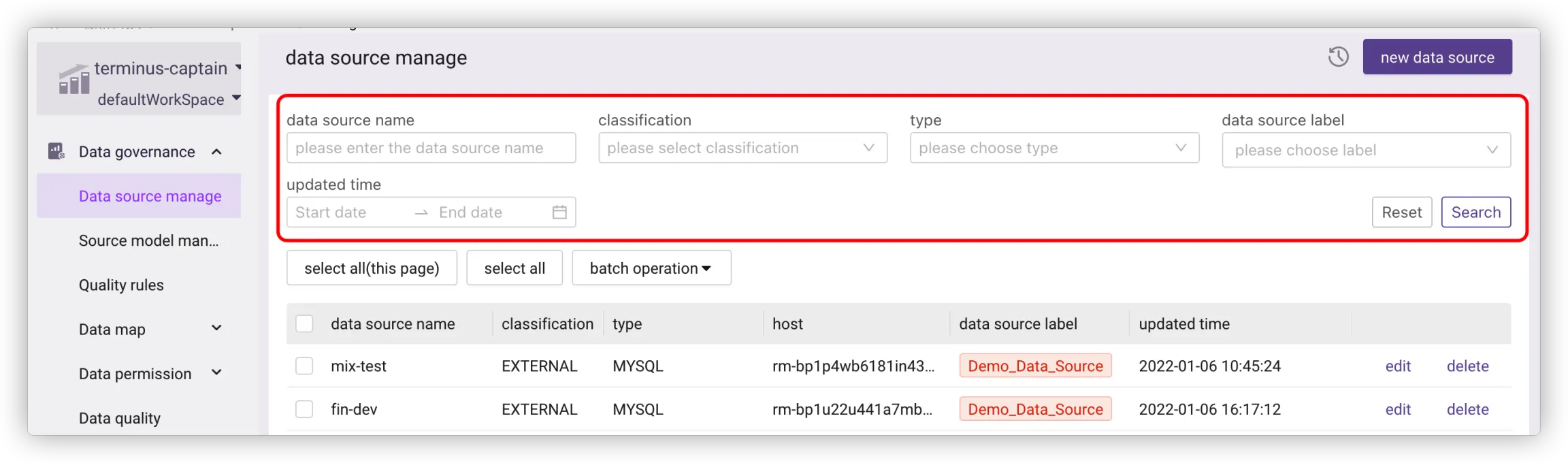 The platform supports filtering data sources by data source name, classification, type, label and other conditions.