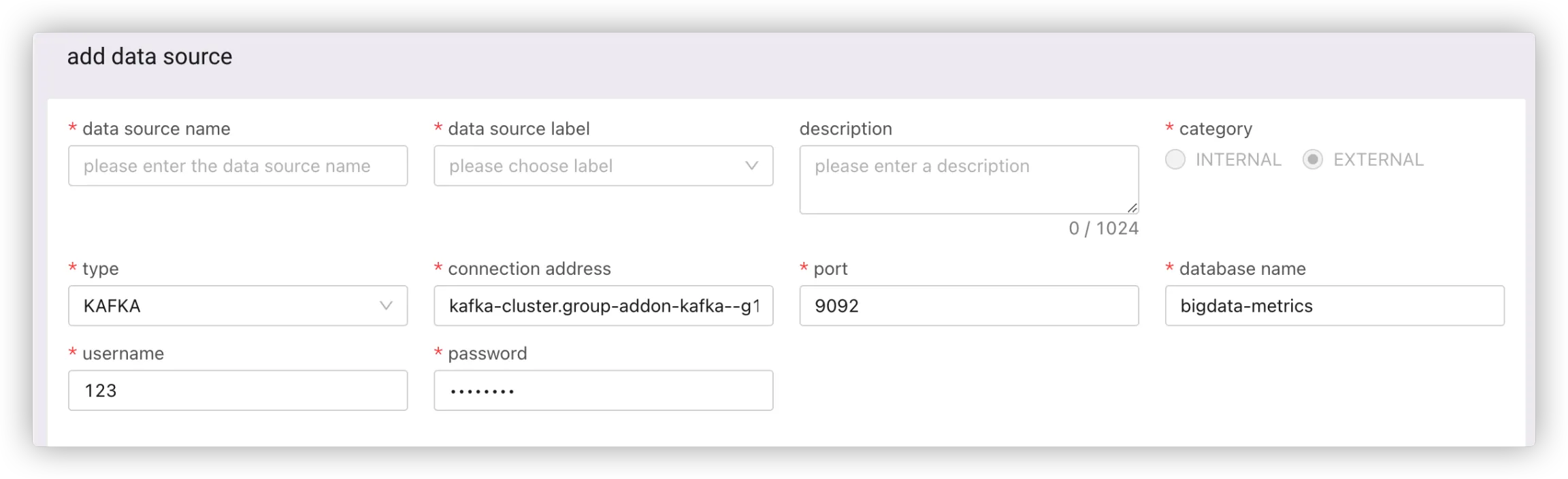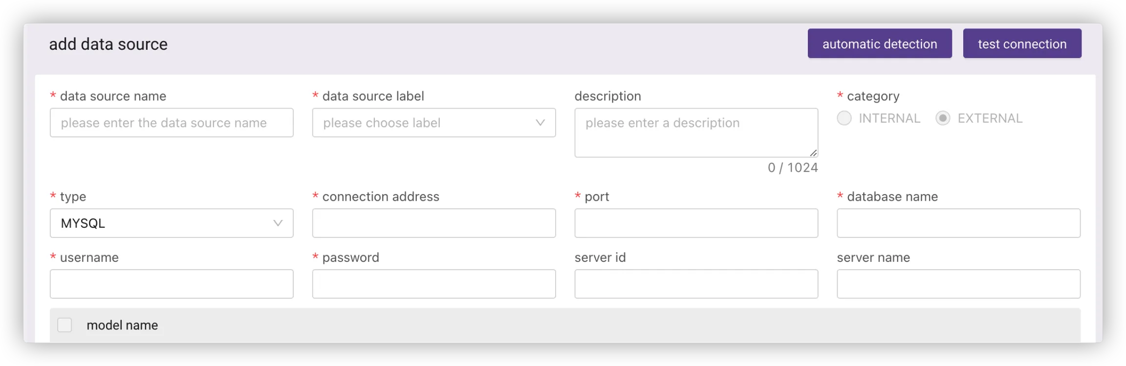 Go to Data Governance > Data Source Management > New Data Source, select the data source type as MySQL and configure the database. Once saved successfully, you can view it on the data source management page.