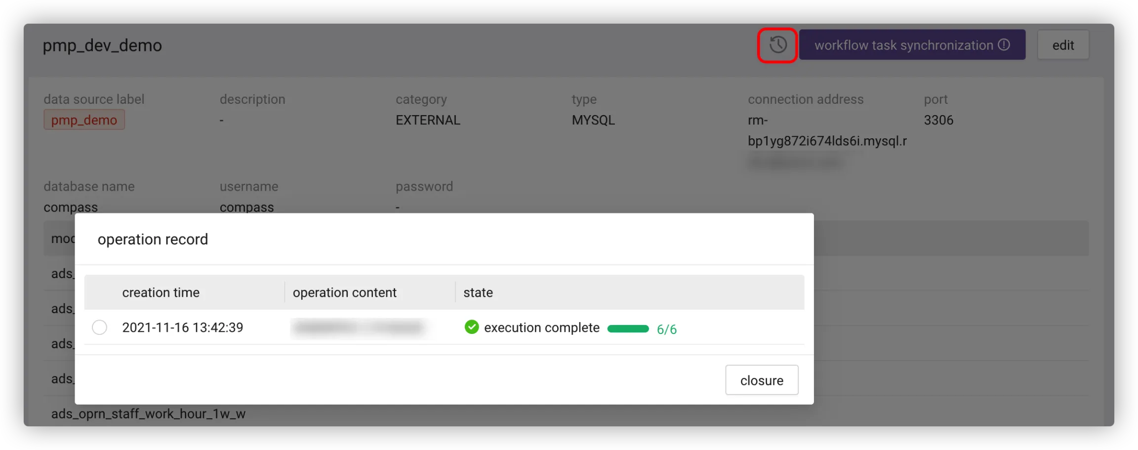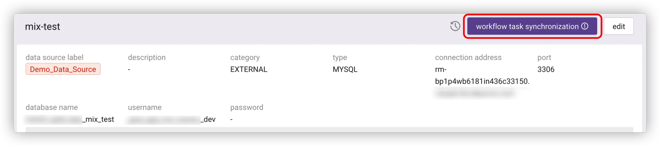 If the data source connection information changes, you can synchronize the workflow with one click on the data source details page.