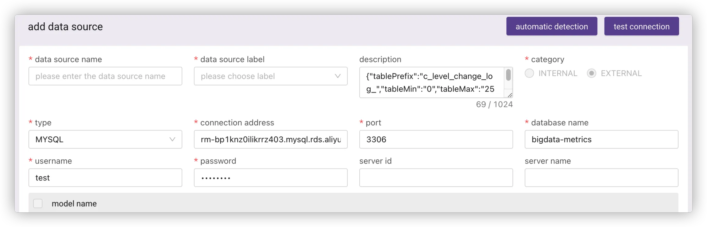 Test Connection: Click to check whether the data source is connected. If the test fails, please check the username, password and other configurations.