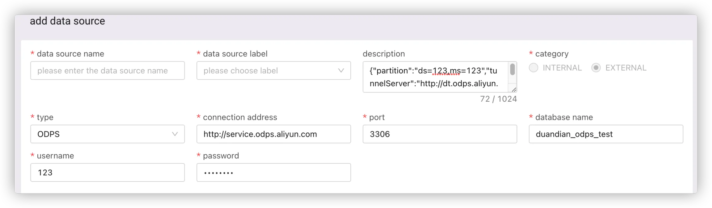 In addition to MySQL, external data source supports Oracle, Db2, CUSTOM, HANA, PostgreSQL, Kafka, ODPS and other types, mainly for the data provided by external customers.