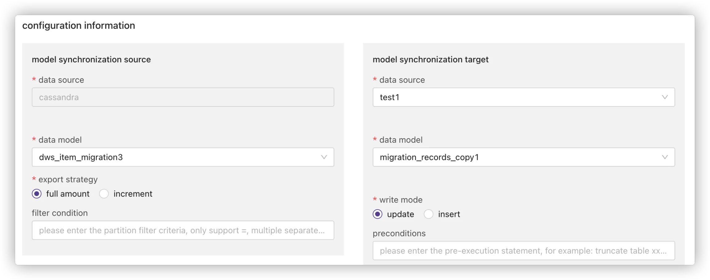 - Select the data model under the data source (create it in advance, and the exported field names, quantity, and order must be the same).