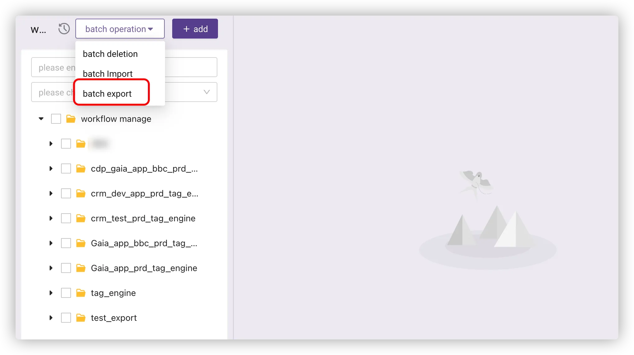 To export workflows, select the workflow folder or workflows and click Batch Export.