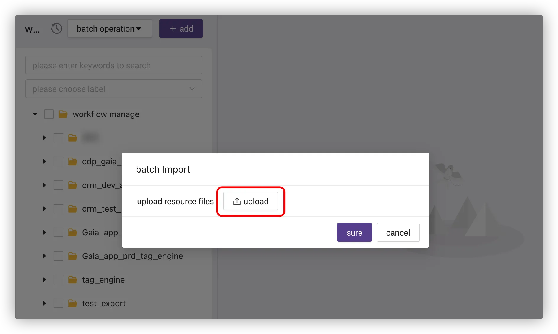 To import workflows, click Batch Import > Upload, and select a local file with a suffix of .workflow.